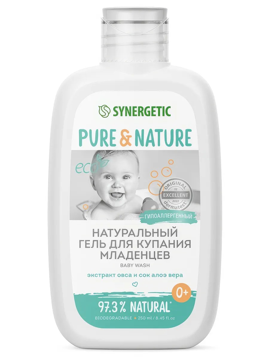 Synergetic Pure&Nature Natural Hypoallergenic Baby Bath Gel with Oat Extract and Aloe Vera Juice, 250 ml. This natural, hypoallergenic SYNERGETIC baby bath gel provides gentle cleansing and reliable protection for delicate baby skin from the first days of life. The safe, effective, and hypoallergenic formula contains lactic acid and the prebiotic trehalose, which gently cleanse the skin, normalize, and preserve the natural microbiome. Bisabolol soothes and helps restore the skin's barrier function. Oat extract is a natural emollient with pronounced antioxidant properties that nourishes, moisturizes, protects, and restores the natural environment of delicate baby skin. Aloe vera juice, combined with sweet almond oil, nourishes and moisturizes the skin, preventing dryness, irritation, and flaking. Ingredients: Benefits: Suitable for babies 0+, hypoallergenic, free of SLS, SLES, parabens, silicones, mineral oils, and dyes. Dermatologically tested by the independent Dermatest Institute in Germany. Not tested on animals. Certified by the British organization The Vegan Society. Directions: Apply a small amount of gel to baby's skin, lather, and rinse thoroughly with water.