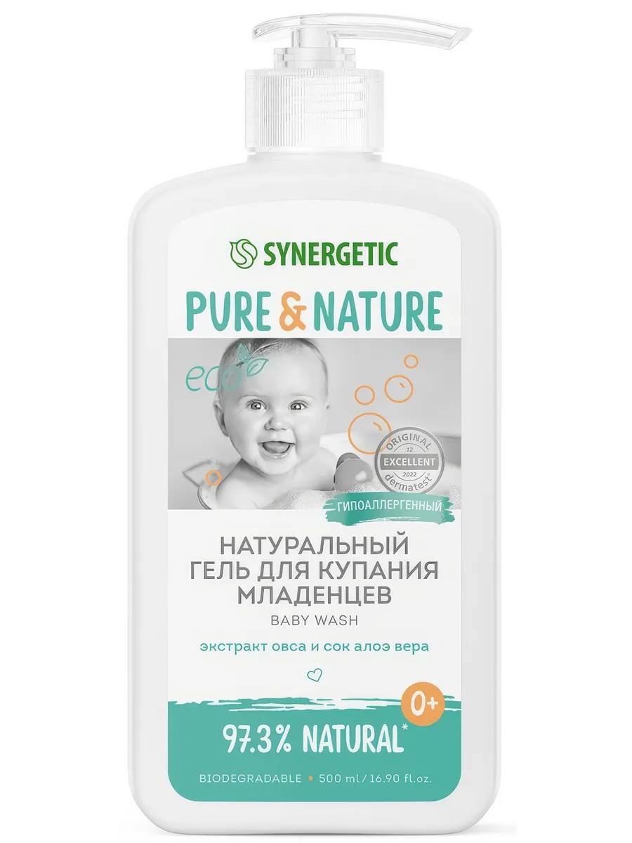 Synergetic Pure&Nature Natural Hypoallergenic Baby Bath Gel with Oat Extract and Aloe Vera Juice, 500 ml. This natural, hypoallergenic SYNERGETIC baby bath gel provides gentle cleansing and reliable protection for delicate baby skin from the first days of life. The safe, effective, and hypoallergenic formula contains lactic acid and the prebiotic trehalose, which gently cleanse the skin, normalize, and preserve the natural microbiome. Bisabolol soothes and helps restore the skin's barrier function. Oat extract is a natural emollient with pronounced antioxidant properties that nourishes, moisturizes, protects, and restores the natural environment of delicate baby skin. Aloe vera juice, combined with sweet almond oil, nourishes and moisturizes the skin, preventing dryness, irritation, and flaking. Ingredients: Benefits: Suitable for babies 0+, hypoallergenic, free of SLS, SLES, parabens, silicones, mineral oils, and dyes. Dermatologically tested by the independent Dermatest Institute in Germany. Not tested on animals. Certified by the British organization The Vegan Society. Directions: Apply a small amount of gel to baby's skin, lather, and rinse thoroughly with water.
