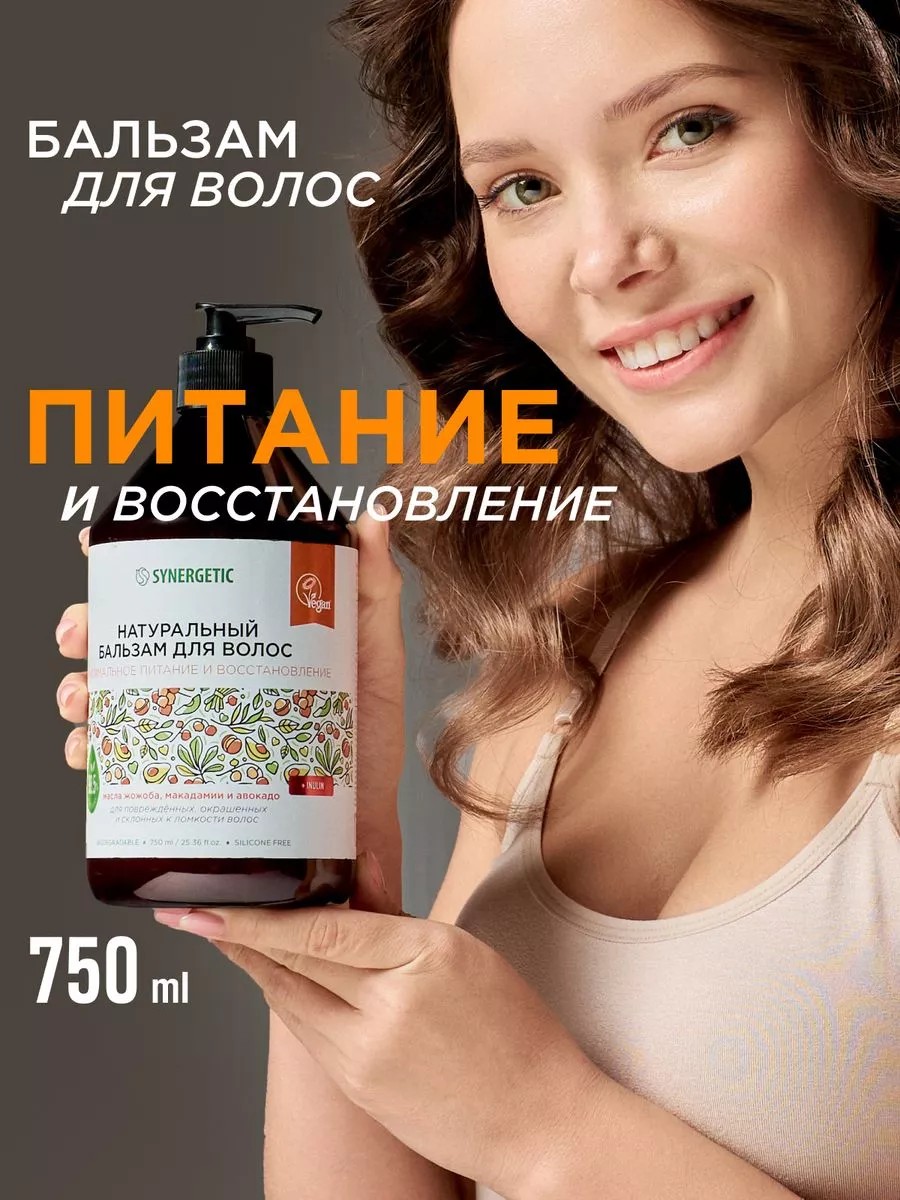 Натуральный бальзам для волос SYNERGETIC Максимальное питание и восстановление 750мл - эффективное средство для ухода за поврежденными, окрашенными и склонными к ломкости волосами, более чем на 98% состоящее из натуральных компонентов.