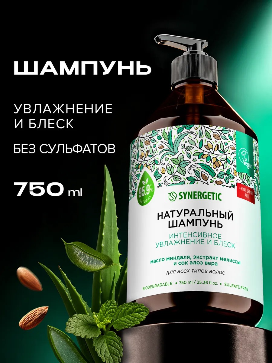 Натуральный бессульфатный шампунь SYNERGETIC "Интенсивное увлажнение и блеск" - эффективное средство для очищения кожи головы и всех типов волос.