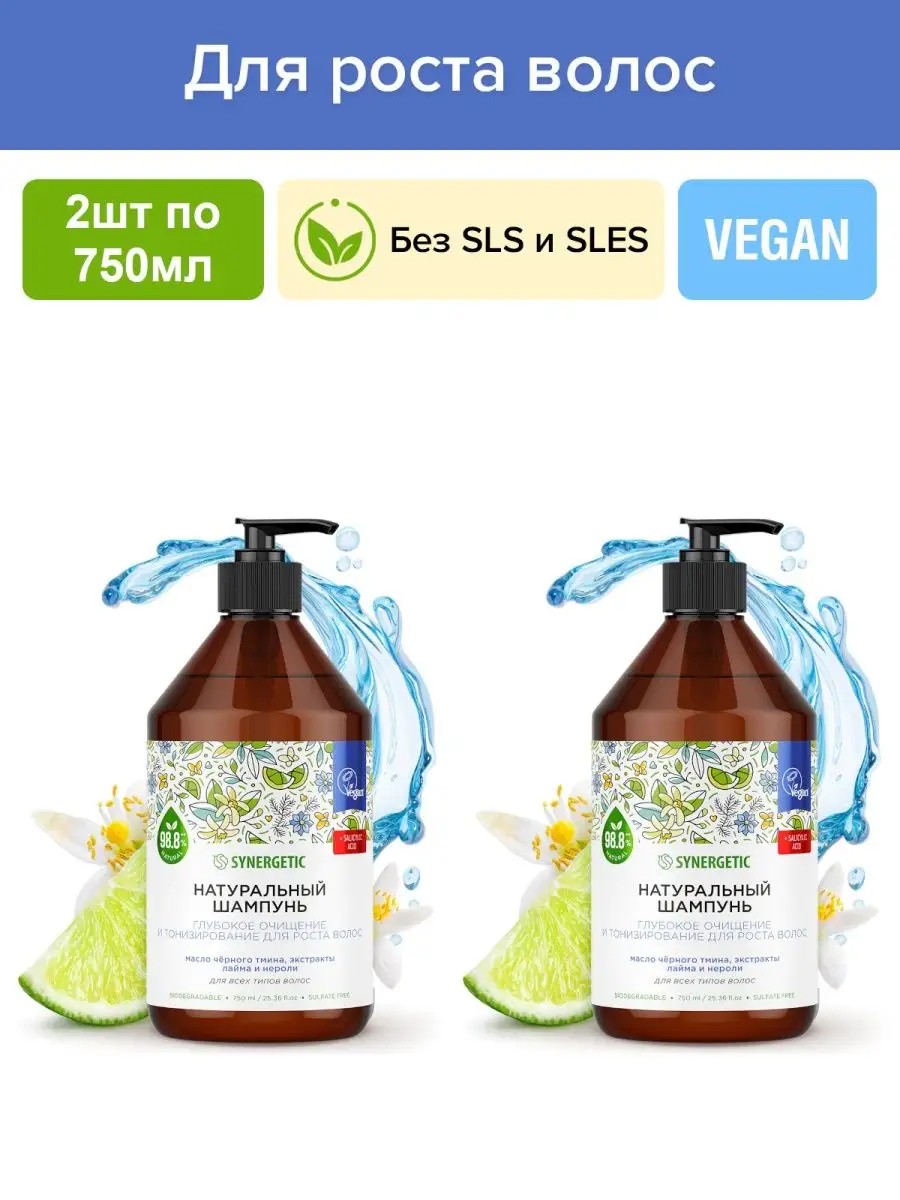 Бессульфатный шампунь SYNERGETIC 2шт по 750мл Глубокое очищение и тонизирование для роста волос — эффективное средство для очищения кожи головы и всех типов волос — более чем на 95% состоит из натуральных компонентов. Шампунь комплексно воздействует на волосы и кожу головы и обеспечивает эффективное очищение. Формула с салициловой кислотой и кофеином оказывает деликатное отшелушивающее действие даже после агрессивных загрязнений и интенсивно питает поврежденные волосы, делая их мягкими и эластичными. Натуральный шампунь содержит масло черного тмина, которое в сочетании с бисабололом обладает успокаивающим действием и увлажняет сухие и ломкие волосы, придавая им ухоженный вид. Сок лайма и ментол усиливают питание корней, помогают уменьшить жирность и улучшают состояние тусклых и тонких волос. Экстракт нероли восстанавливает структуру волос, делая их шелковистыми и блестящими без эффекта утяжеления. Мультифункциональный компонент натурального происхождения софоролипид мягко очищает и сохраняет естественный микробиом кожи головы. Инновационный увлажняющий комплекс усиливает барьерные свойства кожи за счет глубокого увлажнения до 72 часов. Физиологичный уровень pH 5,5 устраняет сухость кожи головы и гарантирует безопасность при частом использовании средства даже для чувствительной кожи. Состав INCI:
