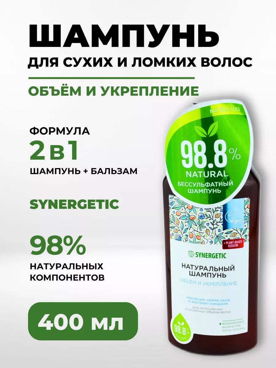 Бессульфатный шампунь SYNERGETIC — эффективное средство для очищения кожи головы и всех типов волос — более чем на 98% состоит из натуральных компонентов. При покупке шампуня рекомендуется обратить внимание на заглавное изображение в карточке товара, чтобы убедиться в правильности выбора функциональности шампуня. Шампунь деликатно очищает, эффективно ухаживает за волосами и защищает кожу головы. Благодаря формуле 2 в 1 бальзам в составе шампуня облегчает расчесывание, придает волосам эластичность, смягчает и увлажняет их. Формула с бетаином восстанавливает поврежденные волосы, укрепляет и стимулирует их рост.Натуральный шампунь содержит комплекс масел миндаля и оливы, который восстанавливает волосы, придает им мягкость и эластичность. Активные компоненты в составе шампуня укрепляют волосы и стимулируют восстановление кератиновых волокон. Экстракты виноградной косточки, бергамота и мелиссы нормализуют баланс кожи головы. Мультифункциональный компонент натурального происхождения софоролипид мягко очищает кожу головы и сохраняет естественный микробиом, а инновационный увлажняющий комплекс усиливает барьерные свойства кожи и обеспечивает до 72 часов глубокого увлажнения. Физиологичный уровень pH 5,5 устраняет сухость кожи головы и гарантирует безопасность при частом использовании средства даже для чувствительной кожи. Натуральный шампунь не содержит SLS, SLES, парабенов, силиконов, минеральных масел и красителей, а также компонентов животного происхождения, не тестируется на животных и сертифицирован британской организацией The Vegan Society. Знак Vegan — мировой стандарт этичной продукции.