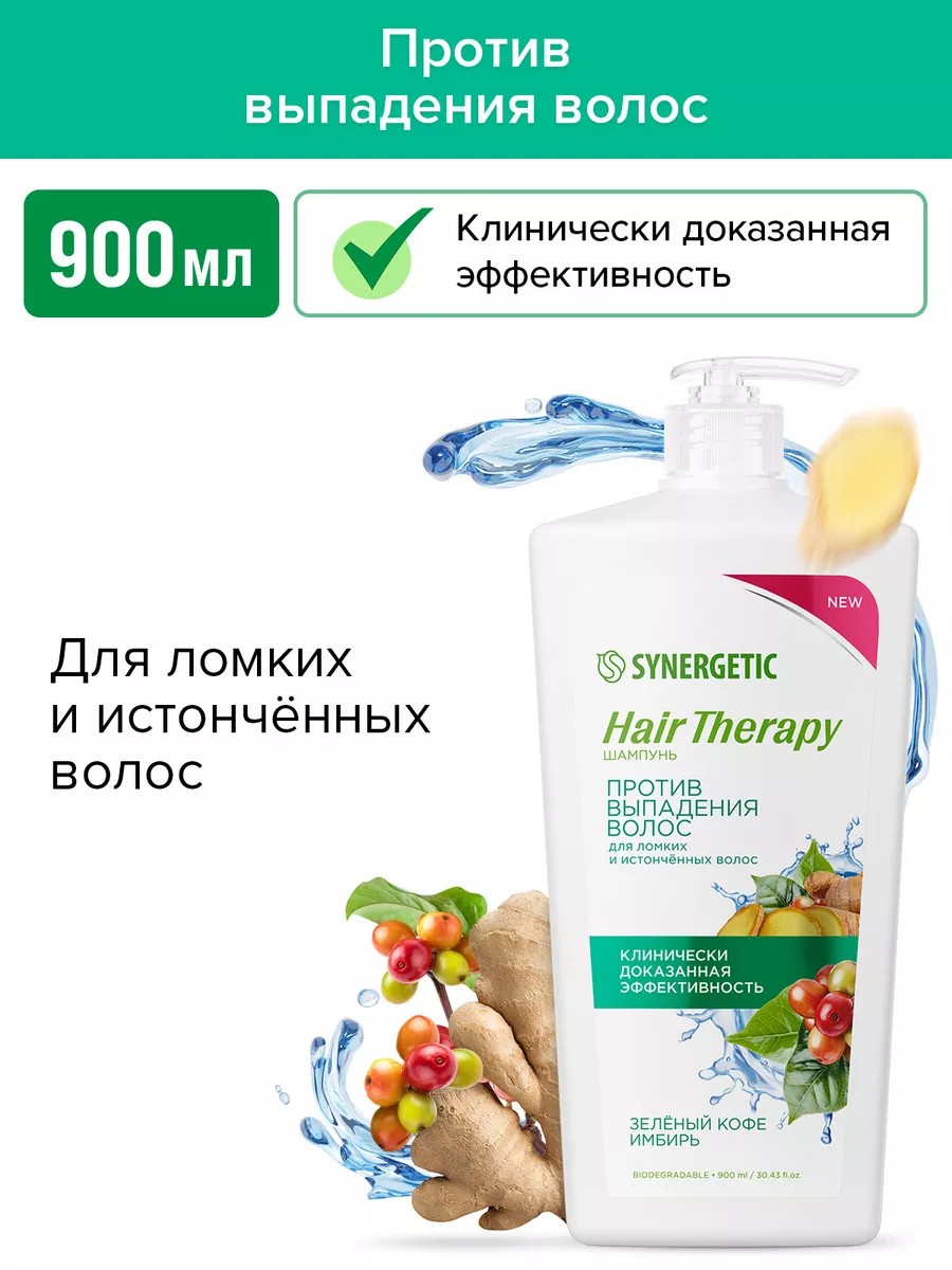 Шампунь SYNERGETIC Против выпадения волос HAIR THERAPY эффективно очищает и ухаживает за волосами и кожей головы. Ниацинамид в сочетании с кофеином оказывают тонизирующее действие, препятствуют выпадению и укрепляют волосы, делая их густыми и здоровыми. Ментол освежает и придаёт заметный прикорневой объём, стимулирует питание волосяных луковиц. Растительный компонент сахарид изомерат способствует интенсивному увлажнению кожи головы, а масло жожоба и экстракты кофе и имбиря придают волосам здоровое сияние и блеск. Мультифункциональный компонент натурального происхождения софоролипид мягко очищает и сохраняет естественный микробиом кожи. Инновационный увлажняющий комплекс усиливает барьерные свойства кожи за счёт глубокого увлажнения до 72 часов. Физиологичный уровень pH 5,5 способствует устранению сухости кожи головы и гарантирует безопасность при частом использовании средства даже для чувствительной кожи. Эффективность шампуня при регулярном использовании подтверждена аккредитованным испытательным центром.ктивные компоненты sku: