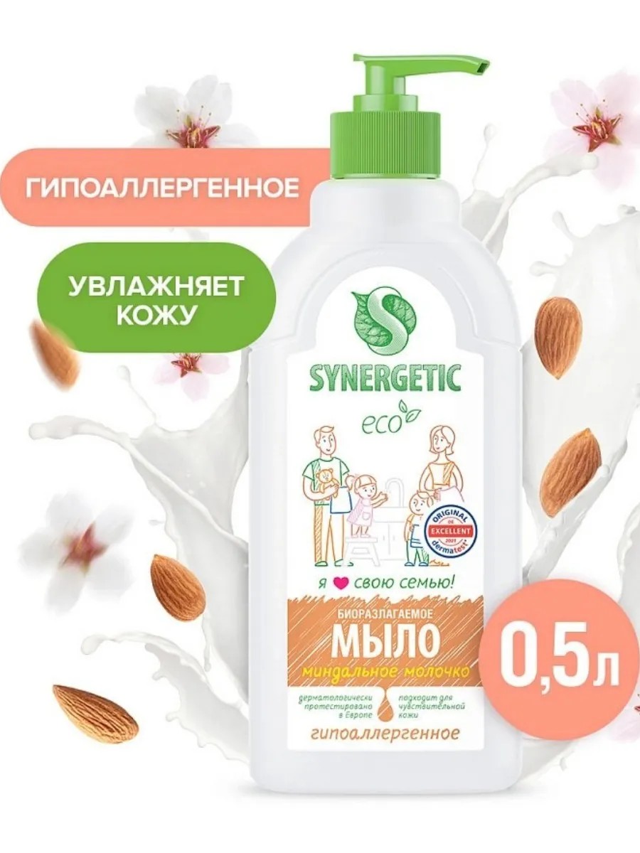 Биоразлагаемое увлажняющее мыло SYNERGETIC "Миндальное молочко" подходит для бережного очищения кожи рук и тела от любых загрязнений.