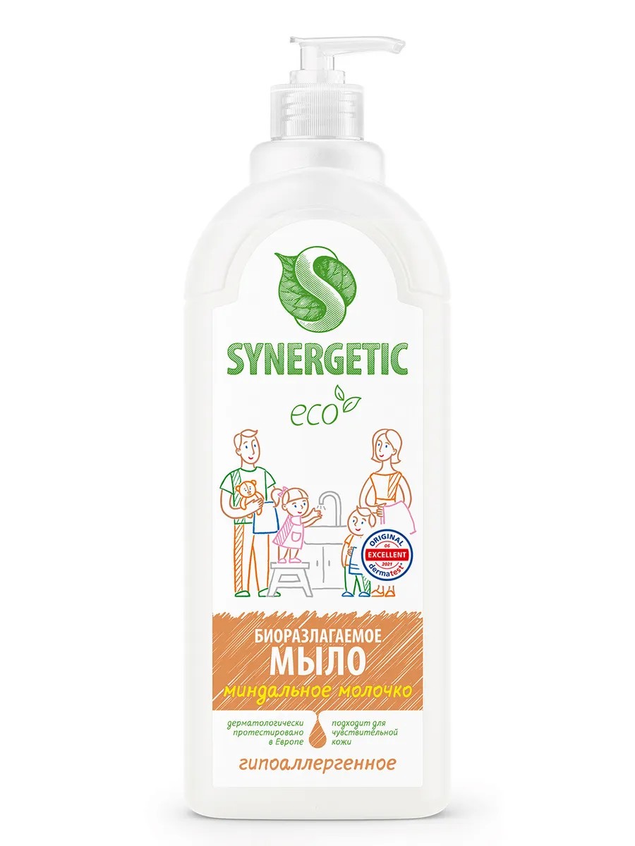 SYNERGETIC Almond Milk Biodegradable Moisturizing Soap is suitable for gently cleansing your hands and body of any impurities. A combination of plant-based A-tensides, sea salt, and natural essential oils of cinnamon, anise, and sandalwood effectively removes dirt and unpleasant odors, even in cold water. Vegetable glycerin provides intensive skin hydration. The multifunctional component sophorolipid gently cleanses and cares for the skin's natural microbiome. This hypoallergenic product is suitable for sensitive skin. The soap has been dermatologically tested by the independent research institute Dermatest in Germany. Biodegradable components are safe for both nature and humans and do not harm the microflora of septic systems. This liquid soap does not contain ingredients of animal origin, is not tested on animals, and is certified by the British organization The Vegan Society. The Vegan label is the global standard for ethical products.