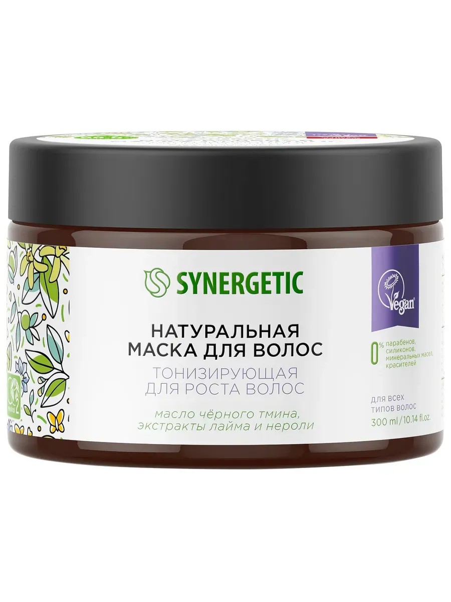 Маска Synergetic Тонизирующая для роста волос, натуральная, для всех типов волос, 300 мл. Натуральная маска SYNERGETIC Тонизирующая для роста волос воздействует на волосы и кожу головы и эффективно решает проблему преждевременного выпадения волос, укрепляя и пробуждая волосяные луковицы. Комплекс масел кокоса и черного тмина оказывает смягчающее действие и интенсивно увлажняет сухие и ломкие волосы, придавая им ухоженный вид. Формула с протеинами люпина тонизирует, стимулирует активный рост волос, возвращая им силу и густоту. Сок лайма помогает уменьшить жирность и улучшает состояние тусклых и тонких волос. Экстракт нероли восстанавливает структуру волос, делая их шелковистыми и блестящими без эффекта утяжеления. Натуральные растительные эмоленты облегчают расчесывание волос и обеспечивают длительный кондиционирующий эффект. Они эффективно смягчают, делая волосы гладкими, блестящими и ухоженными. Натуральная маска не содержит парабенов, силиконов, минеральных масел, красителей и компонентов животного происхождения, не тестируется на животных и сертифицирована британской организацией The Vegan Society. Знак Vegan - мировой стандарт этичной продукции