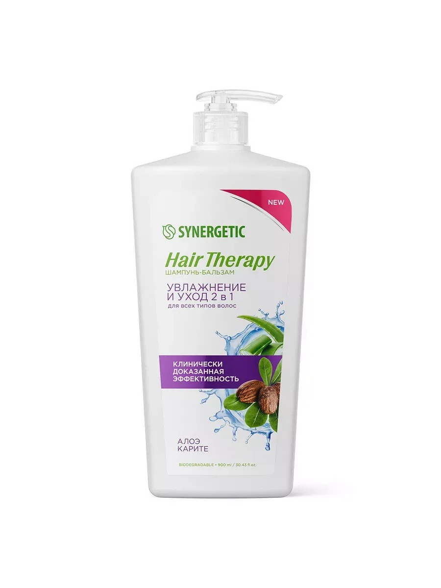 Шампунь-бальзам SYNERGETIC Увлажнение и уход 2 в 1 HAIR THERAPY деликатно очищает, ухаживает за волосами и защищает кожу головы. Формула с цинком восстанавливает поврежденные волосы и стимулирует их рост. Комплекс активных компонентов облегчает расчесывание, придает волосам эластичность и гладкость. Бисаболол смягчает и увлажняет кожу головы, способствуя восстановлению природной мягкости и шелковистости волос. Сок алоэ вера в сочетании с маслом карите укрепляет и питает волосы, помогая решить проблемы ломкости, выпадения и воспаления кожи головы. Мультифункциональный компонент натурального происхождения софоролипид деликатно очищает и сохраняет естественный микробиом кожи. Мягкий эмульгатор изомерат сахарида усиливает барьерные свойства кожи за счет глубокого увлажнения. Физиологичный уровень pH 5,5 способствует устранению сухости кожи головы и гарантирует безопасность при частом использовании средства даже для чувствительной кожи. Эффективность шампуня при регулярном использовании подтверждена аккредитованным испытательным центром