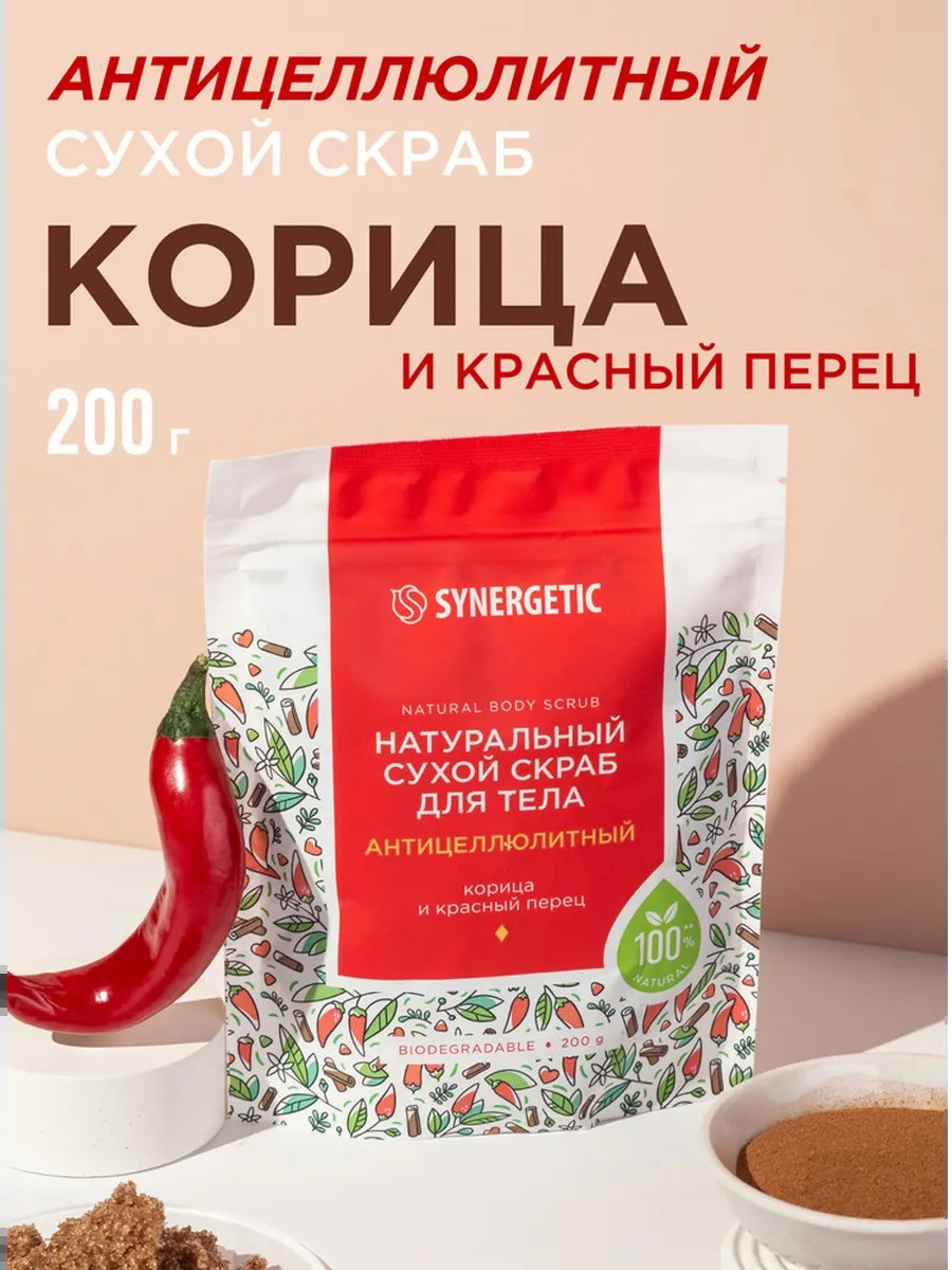 Скраб для тела SYNERGETIC Натуральный сухой антицеллюлитный 200гр пакет. Скраб для тела – это идеальный помощник на пути к красивой и ухоженной коже. Он помогает сохранить упругость и молодость. Парфюмированный аромат создаёт атмосферу уюта и расслабления.