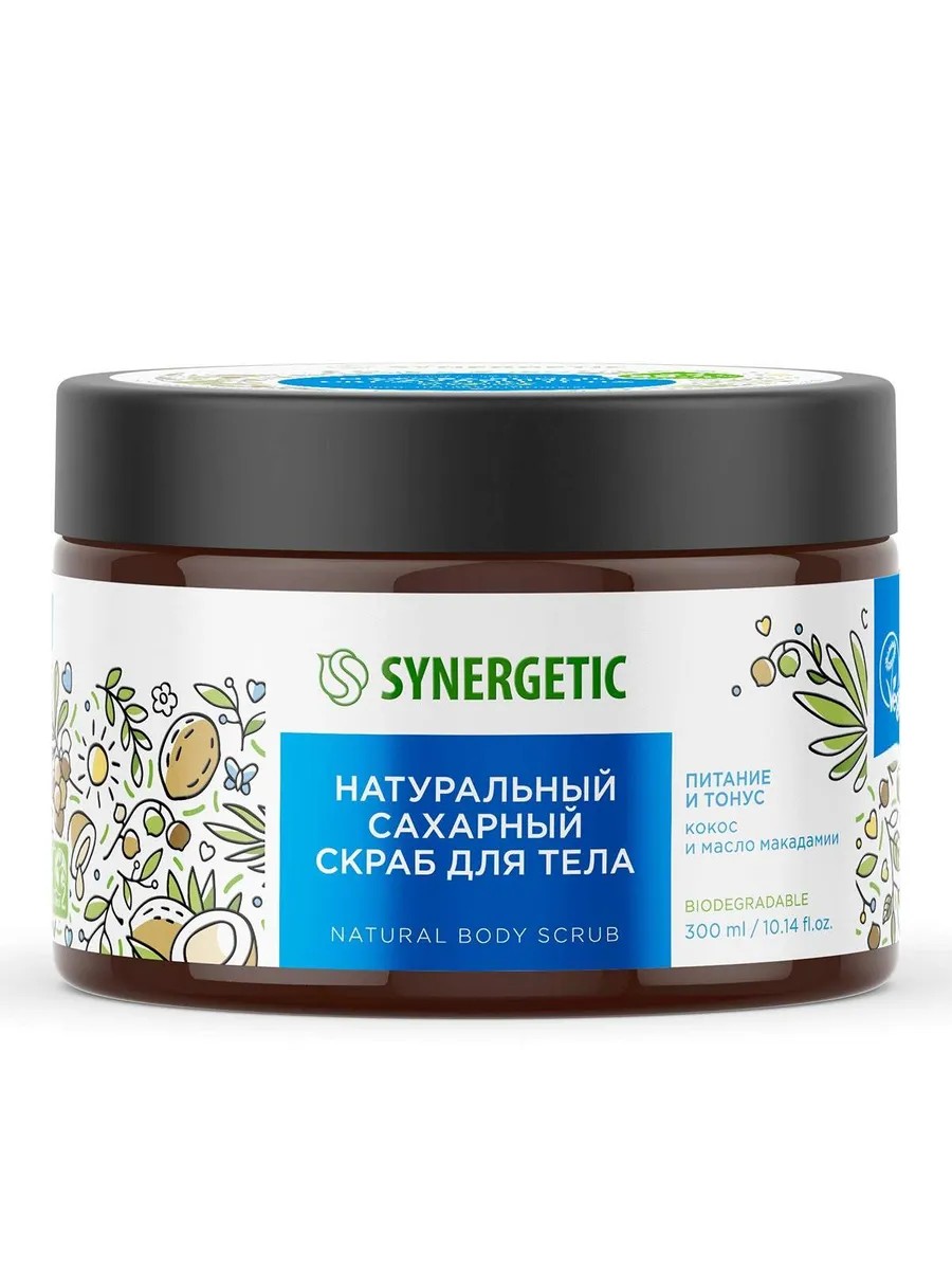 SYNERGETIC Natural Body Scrub, Nourishing and Toning, Coconut and Macadamia Oil, Sugar, 300ml.