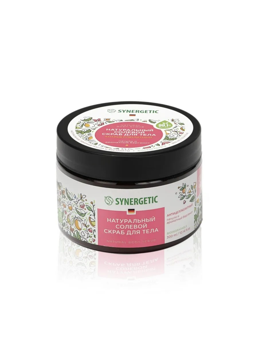 SYNERGETIC Natural Salt Body Scrub is an effective skin care product made from over 99% natural ingredients. The scrub gently cleanses, tightens, and firms the skin. Caffeine helps smooth out fine lines, has a visible anti-cellulite effect, and leaves the skin firm and soft. A complex of almond, shea, and coconut oils has a beneficial effect on the skin, nourishing and intensely moisturizing. Bergamot and verbena extracts normalize the skin's hydrolipid balance. The hypoallergenic perfume composition was developed by the Swiss house of Givaudan. SYNERGETIC Natural Body Scrub with cedarwood, patchouli, and guaiac wood oils leaves a pleasant scent on the skin. It does not contain SLS, SLES, parabens, silicones, mineral oils, dyes, or animal-derived ingredients. It is not tested on animals and is certified by the British organization The Vegan Society.