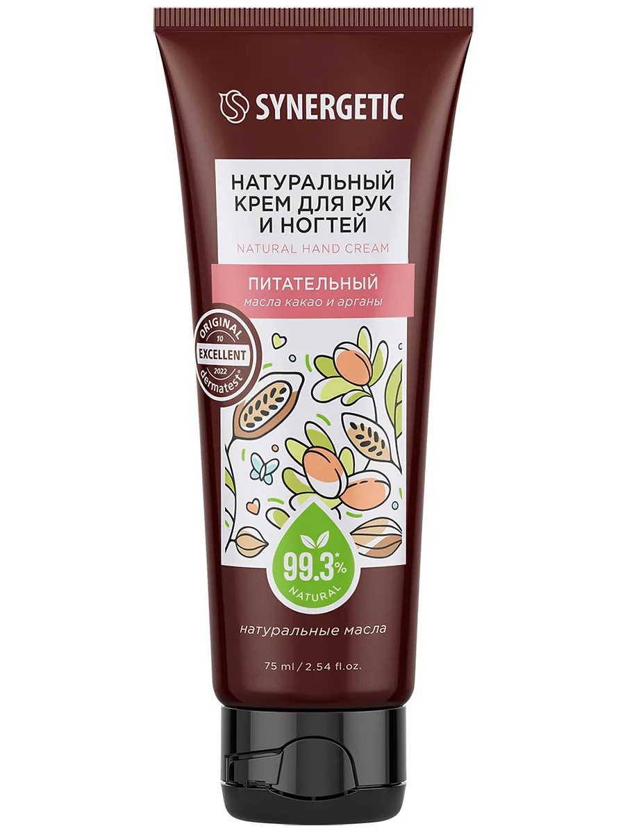 Крем Synergetic Натуральный Питательный для рук, масло какао и органы, 75 мл. Натуральный крем для рук и ногтей SYNERGETIC Питательный интенсивно увлажняет, питает и восстанавливает кожу рук, повышая ее эластичность и упругость. Натуральный пребиотик и природный антиоксидант трегалоза нормализует и сохраняет естественный микробиом кожи. Бисаболол успокаивает и помогает восстановить барьерные функции кожи, снимает раздражения и покраснения, повышает упругость, способствует более глубокому проникновению активных веществ в глубокие слои кожи. Масла карите и какао насыщают сухую кожу и ногтевые пластины полезными микроэлементами, придавая рукам ухоженный вид. Масло арганы с нежным ореховым ароматом насыщено полезными жирными кислотами, которые замедляют процессы старения и поддерживают процессы клеточного обновления кожи, делая ее здоровой, свежей и сияющей. Масло жожоба обеспечивает защитный слой на коже и при этом не оставляет жирного блеска. Насыщенная ультрапитательная текстура крема оставляет ощущение необыкновенной мягкости и комфорта. Состав: Aqua, Cetearyl Alcohol, Glycerin, Butyrospermum Parkii Butter (масло карите), Glyceryl Stearate, Potassium Cetyl Phosphate, Behenyl Alcohol, Isoamyl Laurate, Caprylic/Capric Triglyceride, Coco-Caprylate/Caprate, Stearic Acid, Palmitic Acid, Cetyl Esters, Theobroma Cacao Seed Butter (масло какао), Argan Oil Polyglyceryl-4 Esters (водорастворимое масло арганы), Simmondsia Chinensis Seed Oil (масло жожоба), Saccharide Isomerate, Betaine, Trehalose, Bisabolol, Polyglyceryl-10 Laurate, Sorbitan Caprylate, Propanediol, Benzoic Acid, Xanthan Gum, Parfum, Potassium Hydroxide, Sodium Benzoate, Potassium Sorbate, Citric Acid, Sodium Citrate