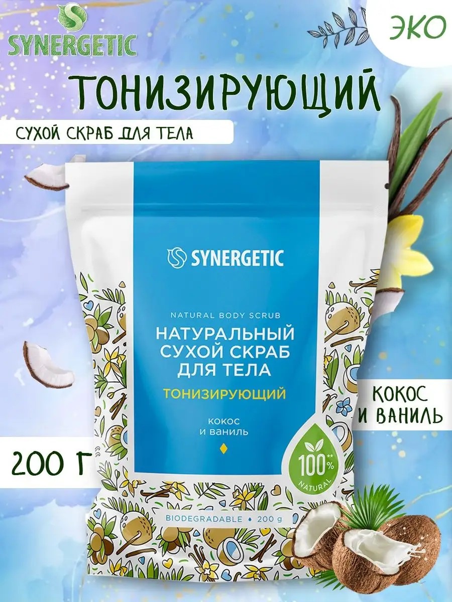 Натуральный сухой скраб для тела SYNERGETIC тонизирующий – это эффективное и безопасное средство для ухода за кожей, полностью состоящее из натуральных компонентов. Скраб бережно очищает, увлажняет и отшелушивает кожу. Натуральный пребиотик инулин нормализует и поддерживает естественный микробиом, а противовоспалительный компонент бисаболол успокаивает, снимает раздражения, выравнивает поверхность кожи и придает ей эластичность и гладкость, способствует более глубокому проникновению активных веществ в глубокие слои кожи. Масло кокоса в сочетании с кокосовой стружкой оказывает тонизирующее действие и эффективно подтягивает кожу, делая ее упругой и бархатистой. Масло бабассу является прекрасным эмолентом, оно глубоко увлажняет и обладает омолаживающими свойствами, при нанесении на кожу придает ей мягкость, успокаивает, предотвращает обезвоживание, делает ее эластичной. Ваниль прекрасно повышает тонус кожи, разглаживает ее, делает мягкой и гладкой. А еще она является природным антисептиком, используется для предотвращения целлюлита, для стимуляции кровообращения, обладает согревающим эффектом. Ноты кокоса и ванили оставляют на коже нежный волнующий аромат. Скраб не содержит SLS, SLES, парабенов, минеральных масел, силиконов, красителей, ароматизаторов. Натуральный сахарный скраб для тела Synergetic антицеллюлитный эффективное средство для ухода за кожей. Скраб Синергетик более чем на 99% состоит из натуральных компонентов. Sinergetic деликатно очищает, подтягивает и укрепляет кожу. Cпособствует разглаживанию микрорельефа, обладает видимым антицеллюлитным эффектом и придает коже упругость и мягкость. Входящие в состав масла благоприятно воздействуют на кожу, питают и интенсивно увлажняют кожу изнутри. Средство подойдет как для тела, так и для лица, рук. Растительные экстракты нормализуют гидролипидный баланс кожи. Гипоаллергенная парфюмерная композиция не вызывает аллергии и подходит даже для самых чувствительных людей.