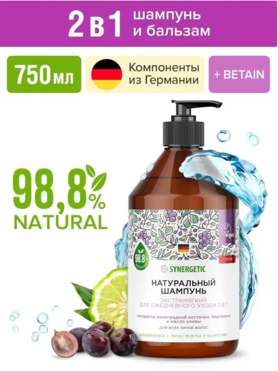 Бессульфатный шампунь SYNERGETIC - эффективное средство для очищения кожи головы и всех типов волос - более чем на 98% состоит из натуральных компонентов.Шампунь деликатно очищает, эффективно ухаживает за волосами и защищает кожу головы. Формула с гиалуроновой кислотой оказывает комплексное воздействие, эффективно увлажняет волосы и придает им здоровое сияние, не утяжеляя.Мультифункциональный компонент натурального происхождения софоролипид мягко очищает кожу головы и сохраняет естественный микробиом, а инновационный увлажняющий комплекс усиливает барьерные свойства кожи и обеспечивает до 72 часов глубокого увлажнения.Натуральный шампунь не содержит SLS, SLES, парабенов, силиконов, минеральных масел и красителей, а также компонентов животного происхождения, не тестируется на животных и сертифицирован британской организацией The Vegan Society. Знак Vegan- мировой стандарт этичной продукции.