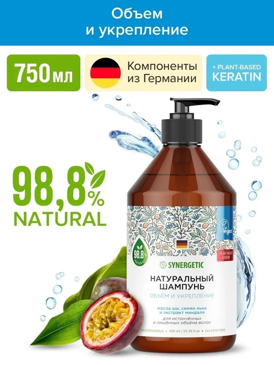 Натуральный бессульфатный шампунь SYNERGETIC Объём и укрепление волос , 0,75 мл