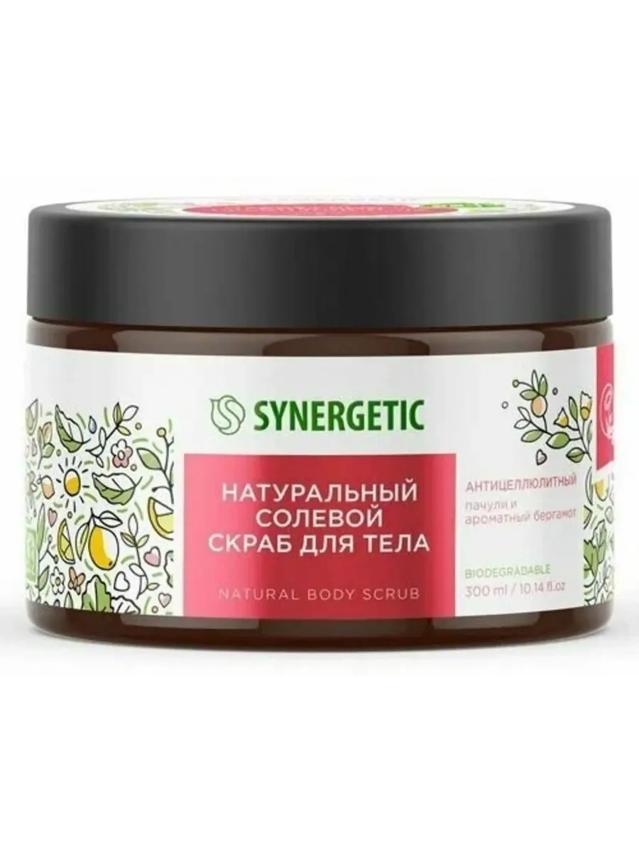 SYNERGETIC 300ml Patchouli and fragrant bergamot natural salt body scrub for anti-cellulite. Caffeine helps smooth microrelief, has a visible anti-cellulite effect, and leaves skin firm and soft. Almond, shea, and coconut oils have a beneficial effect on the skin, nourishing and intensely moisturizing. Bergamot and verbena extracts normalize the skin's hydrolipid balance. The hypoallergenic fragrance composition was developed by the Swiss house of Givaudan, which has been creating fragrances used worldwide in perfumery and cosmetics for over a century.