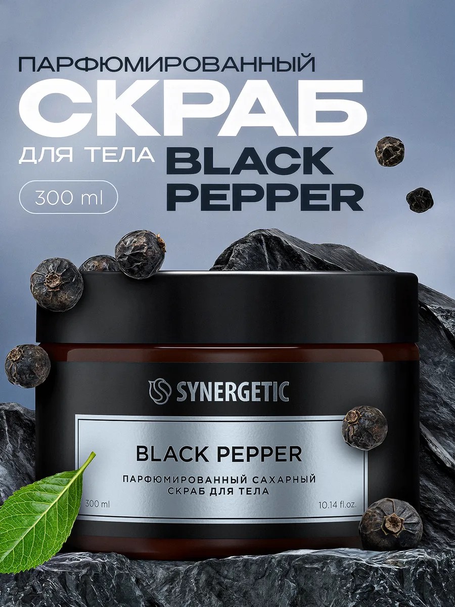 Парфюмированный скраб для тела SYNERGETIC black pepper/черный перец деликатно отшелушивает и очищает кожу. Экстракты кедра и шалфея тонизируют кожу, масло черного тмина дарит упругость, а масло ши бережно увлажняет. Насыщенная и глубокая парфюмерная композиция с восточным характером, который раскрывается элегантностью и чувственностью чёрного перца, мускусными оттенками амбры и пряными нотами специй. В сердце букета – выраженные лесные и дымно-древесные вкрапления, которые словно источают аромат смолистой коры старого тысячелетнего дерева и придают аромату теплоту и соблазнительность. Аромат создаёт уверенное и энергичное настроение, пробуждает силу и страсть, вдохновляет на смелые, авантюрные и захватывающие моменты.