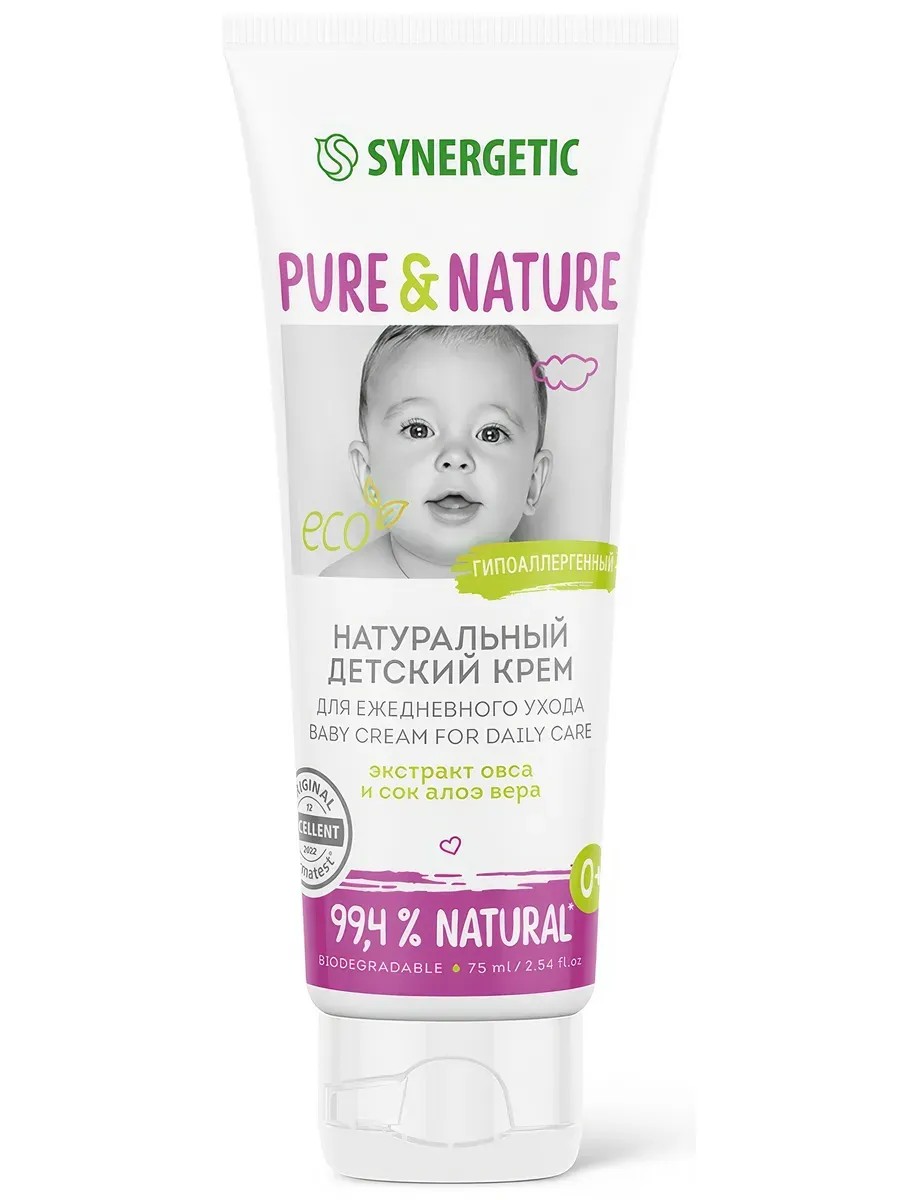 Крем Synergetic Pure&Nature Натуральный Детский для ежедневного ухода, гипоаллергенный, экстракт овса и сок алоэ вера, 75 мл. Натуральный гипоаллергенный детский крем SYNERGETIC 0+ создан для ежедневного ухода за нежной кожей ребенка. Благодаря тщательно подобранным природным компонентам крем обеспечивает интенсивное питание и защиту кожи. Безопасная формула содержит пребиотики инулин и трегалозу, которые нормализуют и сохраняют естественный микробиом кожи. Бисаболол успокаивает и снимает раздражения и покраснения. Экстракт овса это природный эмолент с выраженными антиоксидантными свойствами, защищающий и восстанавливающий естественную среду нежной кожи ребенка. Сок алоэ вера в сочетании с маслами дерева ши и сладкого миндаля питают и увлажняют кожу, предотвращая появление сухости, раздражения и шелушения. Состав: Преимущество: Подходит для детей с первых дней жизни 0+, гипоаллергенный, не содержит парабенов, силиконов, минеральных масел, красителей, дерматологически протестирован независимым институтом Dermatest в Германии, не тестируется на животных и сертифицирован британской организацией The Vegan Society. Инструкция по применению: Нанести массирующими движениями на чистую сухую кожу.