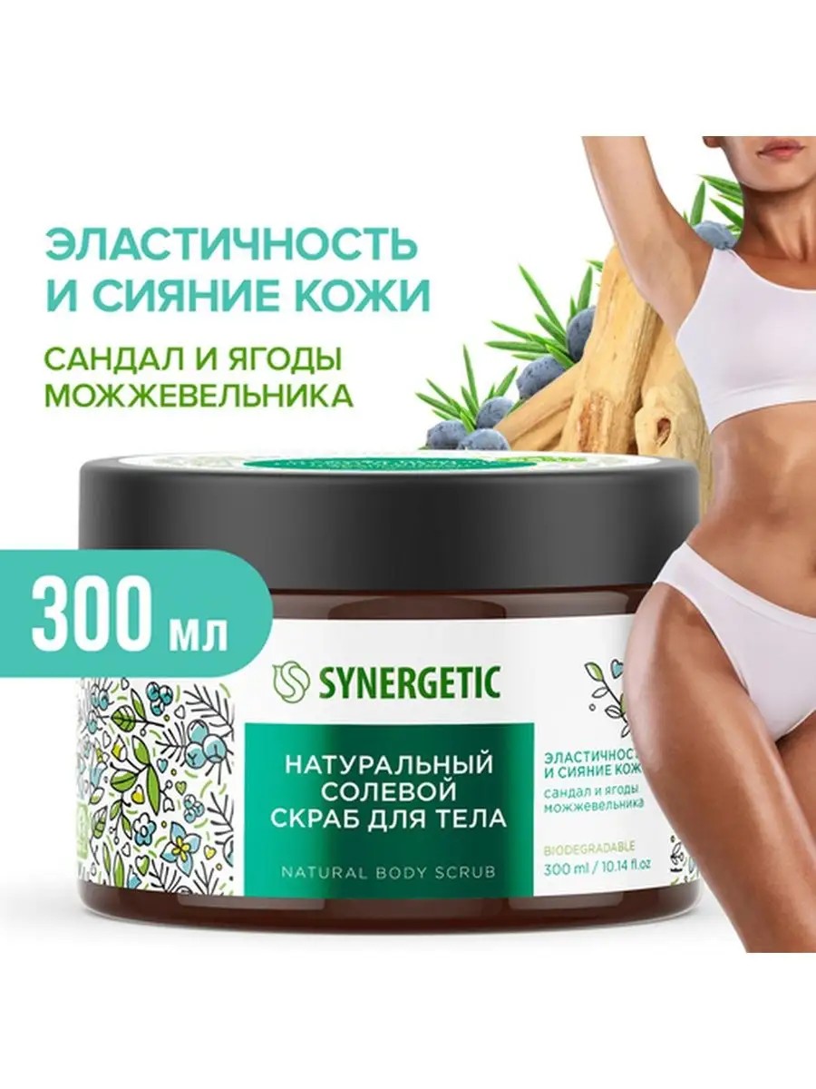 Synergetic Natural Salt Body Scrub for Skin Elasticity and Radiance, Sandalwood, and Juniper Berries is an effective skin care product made with over 99% natural ingredients. The scrub gently exfoliates and cleanses the skin. Shea butter has a regenerating effect, nourishes, and moisturizes, leaving the skin smooth and velvety. A complex of coconut and sweet almond oils provides a powerful toning effect, improving elasticity and radiance. Sandalwood and juniper extracts moisturize the skin. The hypoallergenic fragrance was developed by the Swiss house of Givaudan. The aroma of Synergetic Natural Body Scrub with patchouli, cistus, geranium, gurjum, and pink pepper oils leaves a delightful scent on the skin. This natural scrub is free of SLS, SLES, parabens, silicones, mineral oils, dyes, and animal-derived ingredients. It is not tested on animals and is certified by the UK-based Vegan Society. Directions: Apply the scrub to damp skin, massage in, and rinse thoroughly with water. Oil loss and slight color change may occur, but this does not affect the scrub's quality or properties. Ingredients: Sodium Chloride (salt), Glycerin* (plant-based humectant), Cetearyl Alcohol* (natural thickener), Butyrospermum Parkii Butter* (shea butter), Aqua (water), Prunus Armeniaca Seed Powder* (ground apricot kernel), Sweet Almond Oil Polyglyceryl-4 Esters* (almond oil), Cocos Nucifera Fruit Oil* (coconut oil), Santalum Album (Sandalwood) Wood Extract* (sandalwood extract), Juniperus Communis Fruit/Leaf Water (juniper extract), Cocamidopropyl Betaine* (mild surfactant from coconut oil), Lecithin*, Tocopherol*, Ascorbyl Palmitate*, Hydrogenated Palm Glycerides Citrate (natural antioxidant complex), Parfum (perfume composition based on essential oils).