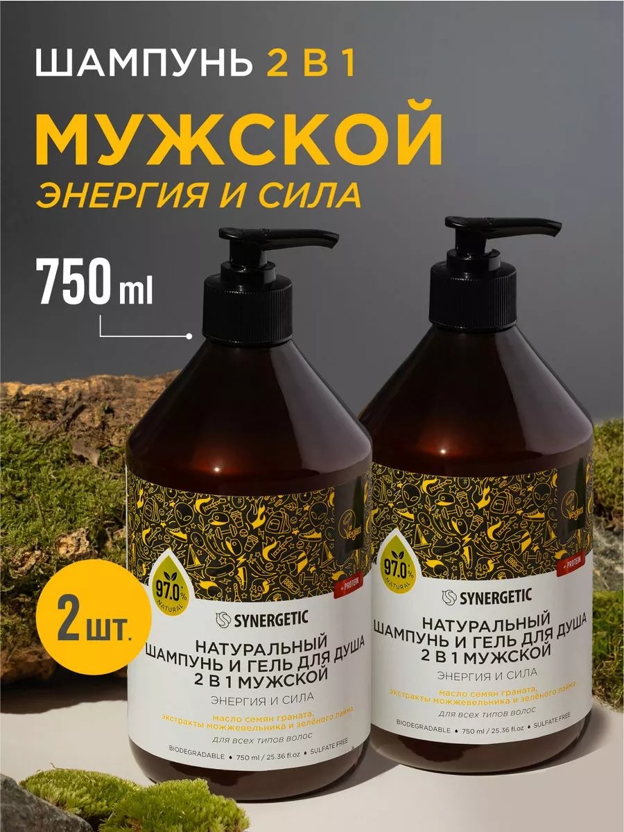 Натуральный бессульфатный шампунь и гель для душа 2 в 1 мужской SYNERGETIC Энергия и сила 2шт по 750мл - эффективное средство для очищения тела, кожи головы и всех типов волос. Бессульфатный шампунь и гель для душа "2 в 1" обеспечивает деликатное очищение и эффективный уход. Формула с протеином восстанавливает поврежденные волосы, укрепляет и оздоравливает их структуру. Комплекс масел гранатовой косточки и макадамии, который оказывает восстанавливающее действие. Инновационные компоненты шампуня укрепляют волосы и стимулируют формирование кератиновых волокон. Экстракты сандала, можжевельника и зеленого кофе активизируют волосяные луковицы и стимулируют рост волос. Мультифункциональный компонент натурального происхождения софоролипид мягко очищает кожу головы и сохраняет естественный микробиом кожи. Инновационный увлажняющий комплекс усиливает барьерные свойства кожи и обеспечивает до 72 часов глубокого увлажнения. Физиологичный уровень pH 5,5 устраняет сухость кожи головы и гарантирует безопасность при частом использовании средства даже для чувствительной кожи. Натуральный шампунь не содержит SLS, SLES, парабенов, силиконов, минеральных масел и красителей, а также компонентов животного происхождения, не тестируется на животных и сертифицирован британской организацией The Vegan Society. Знак Vegan - мировой стандарт этичной продукции. Биоразлагаемые компоненты шампуня безопасны для природы и человека и не наносят вред микрофлоре септических установок.