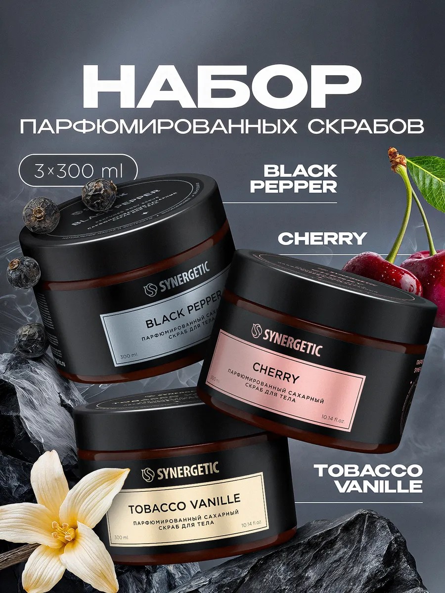 Ценителям более пряных композиций адресован парфюмированный скраб для тела SYNERGETIC «Черный перец», который так же деликатно отшелушивает и очищает кожу. Его формула обогащена натуральными компонентами: экстракты кедра и шалфея тонизируют, масло черного тмина дарит упругость, а масло ши бережно увлажняет. Насыщенная и глубокая парфюмерная композиция имеет восточный характер, который раскрывается элегантностью и чувственностью чёрного перца, мускусными оттенками амбры и пряными нотами специй. В сердце букета — выраженные лесные и дымно-древесные вкрапления, которые словно источают аромат смолистой коры тысячелетнего дерева и придают аромату теплоту и соблазнительность. Аромат создаёт уверенное и энергичное настроение, пробуждает внутреннюю силу и страсть, вдохновляет на смелые, авантюрные и захватывающие моменты.