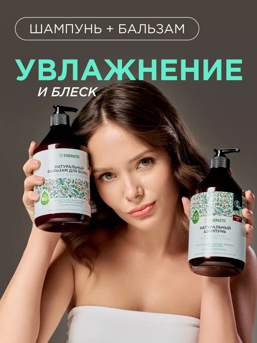 Набор уходовой косметики для волос SYNERGETIC включает в себя шампунь и бальзам для волос «Интенсивное увлажнение и блеск».
