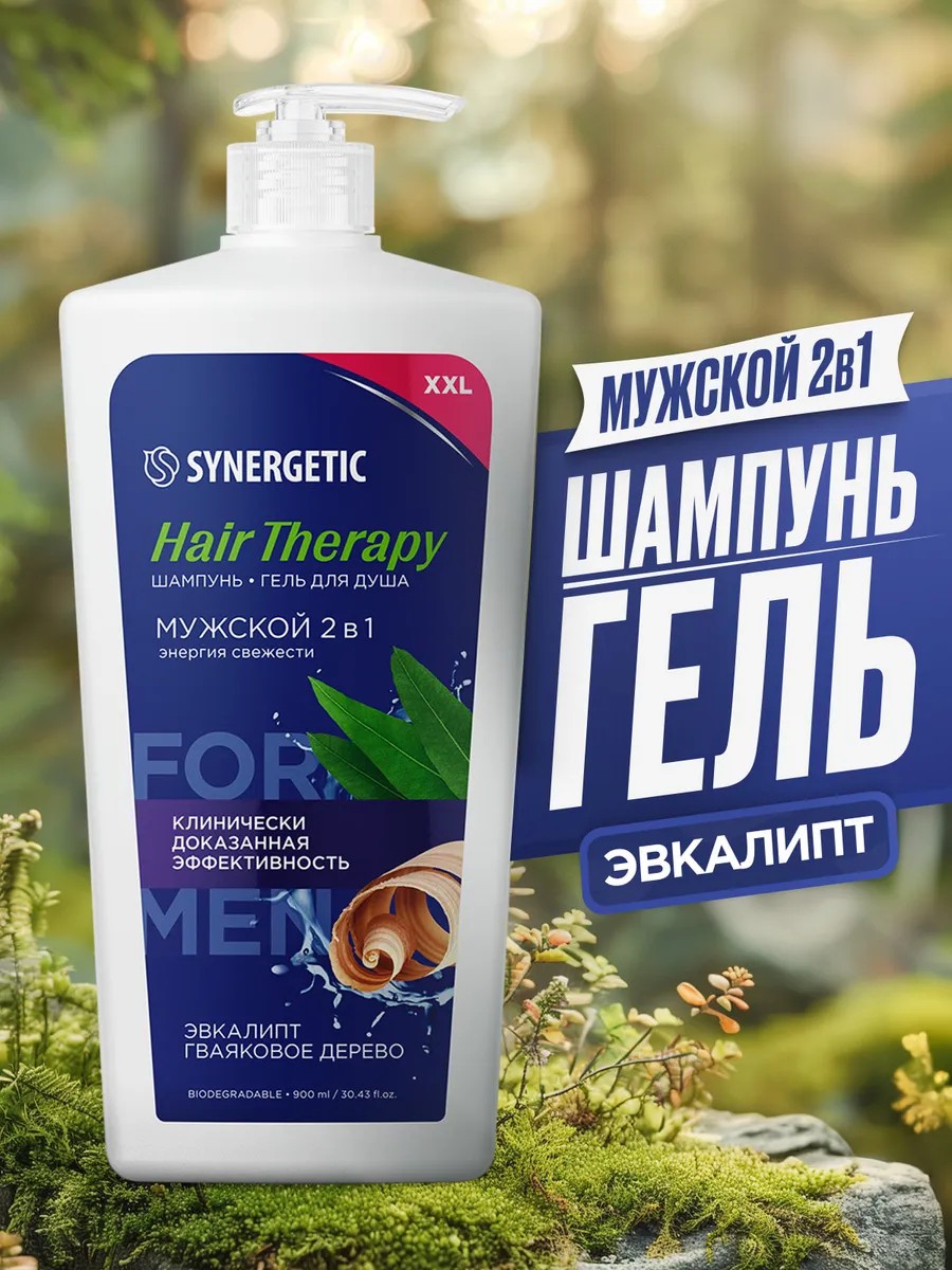 Шампунь-гель для душа 2 в 1 SYNERGETIC мужской HAIR THERAPY 900мл обеспечивает эффективное очищение и бережный уход за волосами, кожей головы и тела. Формула с бисабололом смягчает и увлажняет кожу, помогает уменьшить жирность волос и кожи головы. Экстракты кедра и эвкалипта успокаивают кожу и нормализуют работу сальных желёз. Экстракт асаи способствует регенерации кожи, оживляет волосы, питает и придаёт им силу и естественный блеск без эффекта утяжеления. Экстракт лимона обладает тонизирующим действием, укрепляет и стимулирует рост волос. Мультифункциональный компонент натурального происхождения софоролипид мягко очищает и сохраняет естественный микробиом кожи. Мягкий эмульгатор изомерат сахарида усиливает барьерные свойства кожи за счёт глубокого увлажнения. Физиологичный уровень pH 5,5 способствует устранению сухости кожи головы и гарантирует безопасность при частом использовании средства даже для чувствительной кожи. Эффективность шампуня при регулярном использовании подтверждена аккредитованным испытательным центром.