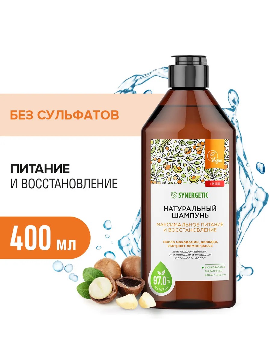 Натуральный бессульфатный шампунь SYNERGETIC "Максимальное питание и восстановление" - эффективное средство для очищения кожи головы и волос. Бессульфатный шампунь обеспечивает деликатное очищение, эффективный уход за волосами и защиту кожу головы. Благодаря входящему в состав природному инулину волосы становятся более гладкими, ухоженными и блестящими. Комплекс масел макадамии, тыквенных семечек и авокадо питает и восстанавливает волосы по всей длине. Инновационные компоненты шампуня укрепляют волосы и стимулируют восстановление кератиновых волокон. Экстракты лемонграсса и франжипани оказывают тонизирующее воздействие. Мультифункциональный компонент натурального происхождения софоролипид мягко очищает кожу головы и сохраняет естественный микробиом. Инновационный увлажняющий комплекс усиливает барьерные свойства кожи и обеспечивает до 72 часов глубокого увлажнения. Физиологичный уровень pH 5,5 устраняет сухость кожи головы и гарантирует безопасность при частом использовании средства даже для чувствительной кожи. Натуральный шампунь не содержит SLS, SLES, силиконов, минеральных масел и красителей, а также компонентов животного происхождения, не тестируется на животных и сертифицирован британской организацией The Vegan Society. Знак Vegan - мировой стандарт этичной продукции. Биоразлагаемые компоненты шампуня безопасны для природы и человека и не наносят вред микрофлоре септических установок.