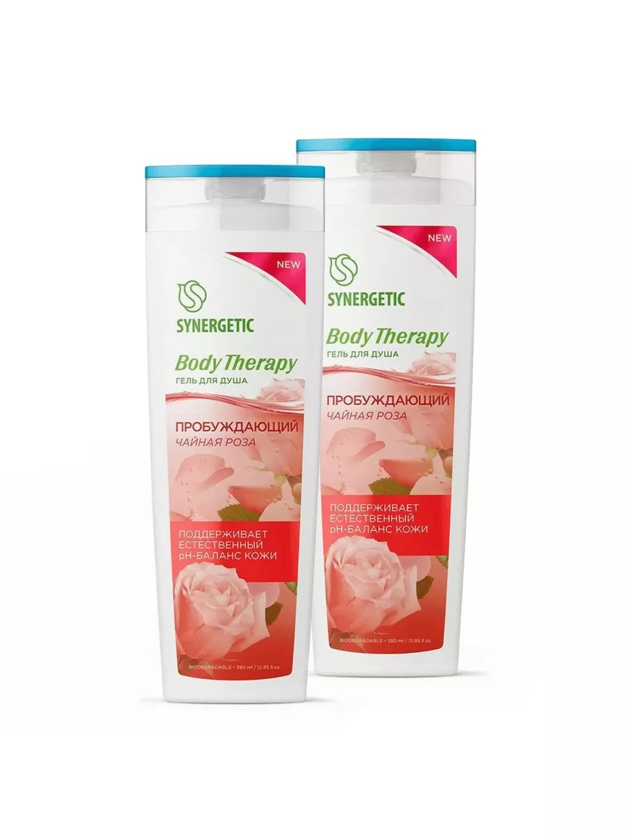 SYNERGETIC Tea Rose Shower Gel BODY THERAPY 380 ml 2 pcs. SYNERGETIC Tea Rose Shower Gel BODY THERAPY is a gentle and effective skin cleanser. This plant-based shower gel gently cleanses and cares for sensitive skin. Its effective formula with saccharide isomerate and bisabolol nourishes the skin with beneficial elements, promotes regeneration, and restores the hydrolipidic balance. Betaine effectively nourishes, moisturizes, and strengthens the skin, eliminating dryness and tightness. Tea rose flower extract actively moisturizes and strengthens sensitive skin, helps reduce dryness and irritation, and has an overall toning effect. The delicate floral aroma lifts the mood and charges with positive emotions. The multifunctional component of natural origin, sophorolipid, gently cleanses and preserves the skin's natural microbiome. A physiological pH of 5.5 helps eliminate dryness and ensures safety with frequent use, even for sensitive skin. Efficacy with regular use has been confirmed by an accredited testing center. Ingredients: Aqua, Sodium Coco-Sulfate, Cocamidopropyl Betaine, Lauryl Glucoside, Sodium Chloride, Sodium Lauroyl Sarcosinate, Candida Bombicola/Glucose/Methyl Rapeseedate Ferment, Bisabolol, Rosa Floribunda Flower Extract, Saccharide Isomerate, Glycerin, Parfum, Tetrasodium Glutamate Diacetate, Sodium Citrate, Potassium Sorbate, Sodium Benzoate, Benzyl Alcohol, Benzoic Acid, Dehydroacetic Acid, Citric Acid.