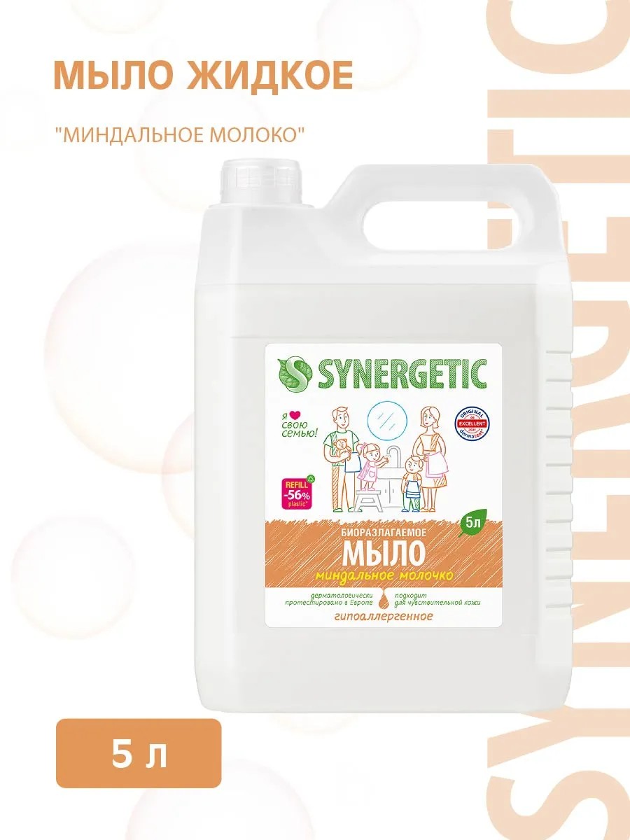 Биоразлагаемое увлажняющее мыло SYNERGETIC "Миндальное молочко" 5 л подходит для бережного очищения кожи рук и тела от любых загрязнений.