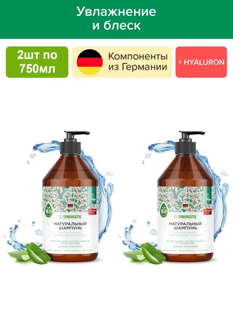 Натуральный бессульфатный шампунь SYNERGETIC Интенсивное увлажнение и блеск 2шт по 750мл - эффективное средство для очищения кожи головы и всех типов волос. Шампунь обеспечивает деликатное очищение, эффективный уход за волосами и защиту кожу головы. Формула с гиалуроновой кислотой оказывает комплексное воздействие, эффективно увлажняет волосы и придает им здоровое сияние, не утяжеляя их. Комплекс масел миндаля, арганы и конопли оказывает восстанавливающее действие. Инновационные компоненты шампуня укрепляют волосы и стимулируют восстановление кератиновых волокон. Сок алоэ вера и экстракт мелиссы придают волосам эластичность и блеск. Мультифункциональный компонент натурального происхождения софоролипид мягко очищает кожу головы и сохраняет естественный микробиом. Инновационный увлажняющий комплекс усиливает барьерные свойства кожи и обеспечивает до 72 часов глубокого увлажнения. Физиологичный уровень pH 5,5 устраняет сухость кожи головы и гарантирует безопасность при частом использовании средства даже для чувствительной кожи. Натуральный шампунь не содержит SLS, SLES, парабенов, силиконов, минеральных масел и красителей, а также компонентов животного происхождения.