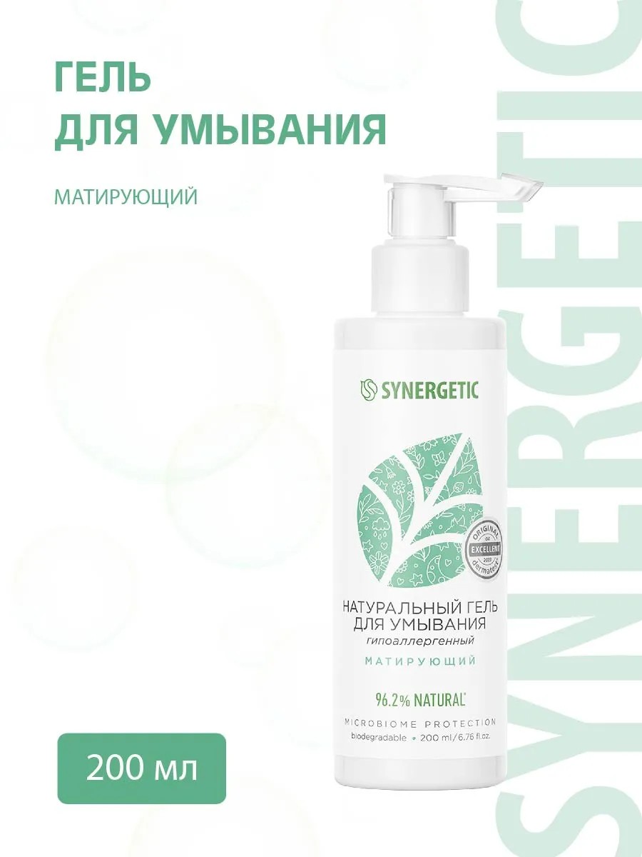 Гель для умывания SYNERGETIC матирующий 200 мл. Гипоаллергенный матирующий гель для умывания SYNERGETIC деликатно очищает кожу, легко смывается водой, обеспечивая бережный ежедневный уход и чувство свежести. Комплекс молочной и шикимовой кислот ускоряет процесс регенерации клеток, выравнивая тон, разглаживая мелкие морщинки и устраняя несовершенства. Миндальное масло снимает раздражение и покраснение. Экстракты асаи и вербены способствуют уменьшению жирного блеска, препятствуя образованию акне, черных точек и других несовершенств, придавая коже лица здоровое сияние. Натуральный пребиотик трегалоза, мультифункциональные софоролипиды и растительный увлажнитель изомерат сахарида нормализуют и сохраняют естественный микробиом кожи. Состав: Aqua, Sodium Cocoamphoacetate (мягкий ПАВ), Cocamidopropyl Betaine (мягкий ПАВ), Glycerin (растительный увлажнитель), Polyglyceryl-10 Laurate (натуральный солюбилизатор), Caprylyl/Capryl Glucoside (мягкий ПАВ), Candida Bombicola/Glucose/Methyl Rapeseedate Ferment (софоролипиды рапсового масла), Verbena Officinalis Leaf Extract (экстракт вербены), Euterpe Oleracea Fruit Extract (экстракт асаи), Shikimic Acid (шикимовая кислота), Sweet Almond Oil Polyglyceryl-4 Esters (масло миндаля), Cellulose Gum, Algin, Xanthan Gum (натуральные загустители), Saccharide Isomerate (растительный увлажнитель), Trehalose (натуральный полисахарид, пребиотик), Lactic Acid (молочная кислота), Parfum, Dehydroacetic Acid, Benzyl Alcohol, Benzoic Acid, Sodium Benzoate, Potassium Sorbate (консерванты), Citric Acid, Sodium Citrate (регуляторы кислотности).