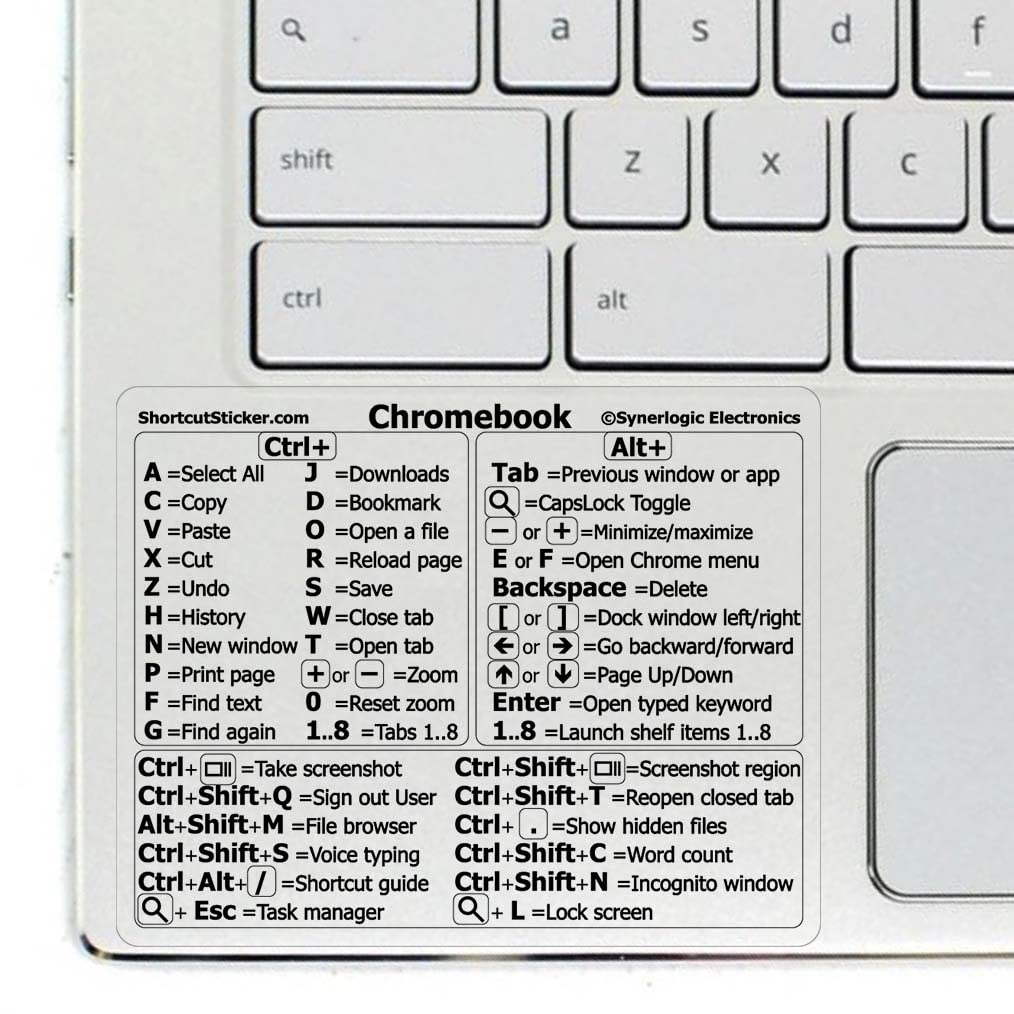 SYNERLOGIC Chromebook Reference Keyboard Shortcut Sticker Your Chromebook Essential Shortcuts Sticker is an accurate, comprehensive list of keyboard shortcuts that you need. It contains a list of shortcuts for any brand running on Chrome operating system and fits easily on the bottom corner of your laptop so you can quickly look down and read it. It is perfect for the beginner who wants to learn how to use their Chromebook and save time by having the key Chrome OS shortcuts at their fingertips. Designed by SYNERLOGIC, the sticker is made of military-grade waterproof vinyl and is more durable and convenient than a printout of the shortcuts. Convenience At Your Fingertips Are you looking to increase your productivity or simply want to learn how to use your shiny new Chromebook like a pro? Having the most essential Chrome OS shortcuts in front of you will help you quickly learn the ins and outs of your Chromebook. Whether for business or personal use, you’ll be able to easily navigate and operate your Chrome computer so that you can work faster and smarter. Perfect For Learning Your Chromebook If you have a new Chromebook and want to learn how to use it like a pro, this sticker is for you! You’ll have the shortcuts right in front of you, so you can learn and memorize them without having to look them up or print them out. You’ll be using your Chrome OS computer like a pro with the Reference Keyboard Shortcut Sticker. IT MAKES A PERFECT GIFT Copyright ©2021 Design and production by Synerlogic Electronics, Bay City, MI, San Diego, CA and Boca Raton, FL, United States. All Rights Reserved.✓? Original Design and Production by Synerlogic Electronics, San Diego, CA, Boca Raton, FL and Bay City, MI, United States 2020. All rights reserved, any commercial reproduction without permission is punishable by all applicable laws. ✓? From BASIC to ADVANCED - Whether you are a seasoned computer professional or a beginner, the SYNERLOGIC Sticker will save you both time and frustration, guaranteed! You can easily reach a new level of computer proficiency using our convenient and affordable sticker. ✓? QUALITY GUARANTEE - We stand behind our product! It’s made with outstanding military-grade durable vinyl and the professional design gives our stickers an OEM appearance. Our responsive and dedicated customer service team is here to promptly respond to your messages and resolve any issues you may have. ✓? Work FASTER and SMARTER - Quick tips at your fingertips! This tool makes it easy to learn how to use your computer much faster and makes your workflow increase exponentially. It’s perfect for any age or skill level, students or seniors, at home, or in the office. ✓? Size 3"x2.4" designed to fit even 11.6" screen Chromebooks. Compatible and fits any Chromebook running Chrome OS. Compatible brands include Acer, HP, Dell, Samsung, Asus, Lenovo, Pixelbook and more.Unit Count: 1.0 Count. Pattern: Solid. Reusability: Single Use. Age Range (Description): Adult. Special Feature: Waterproof. Theme: Quotes. Material: Vinyl. Item Dimensions LxWxH: 3 x 2.4 x 0.01 inches. Color: Clear. Brand: Synerlogic. Best Sellers Rank: #7,049 in Computers & Accessories. Customer Reviews: 4.7 out of 5 stars 205 ratings 4.7 out of 5 stars. Date First Available: ?February 6, 2022. : ?B09RW9WBJ8. Manufacturer: ?Synerlogic Electronics. Product Dimensions: ?3 x 2.4 x 0.01 inches. Item Weight: ?0.493 ounces. Item model number: ?SCS-C-CL1. League: ?Ncaa. Unit Count: ?1.0 Count. Pattern: ?Solid. Reusability: ?Single Use. Age Range (Description): ?Adult. Special Feature: ?Waterproof. Theme: ?Quotes. Material: ?Vinyl. Item Dimensions LxWxH: ?3 x 2.4 x 0.01 inches. Color: ?Clear. Brand: ?Synerlogic.
