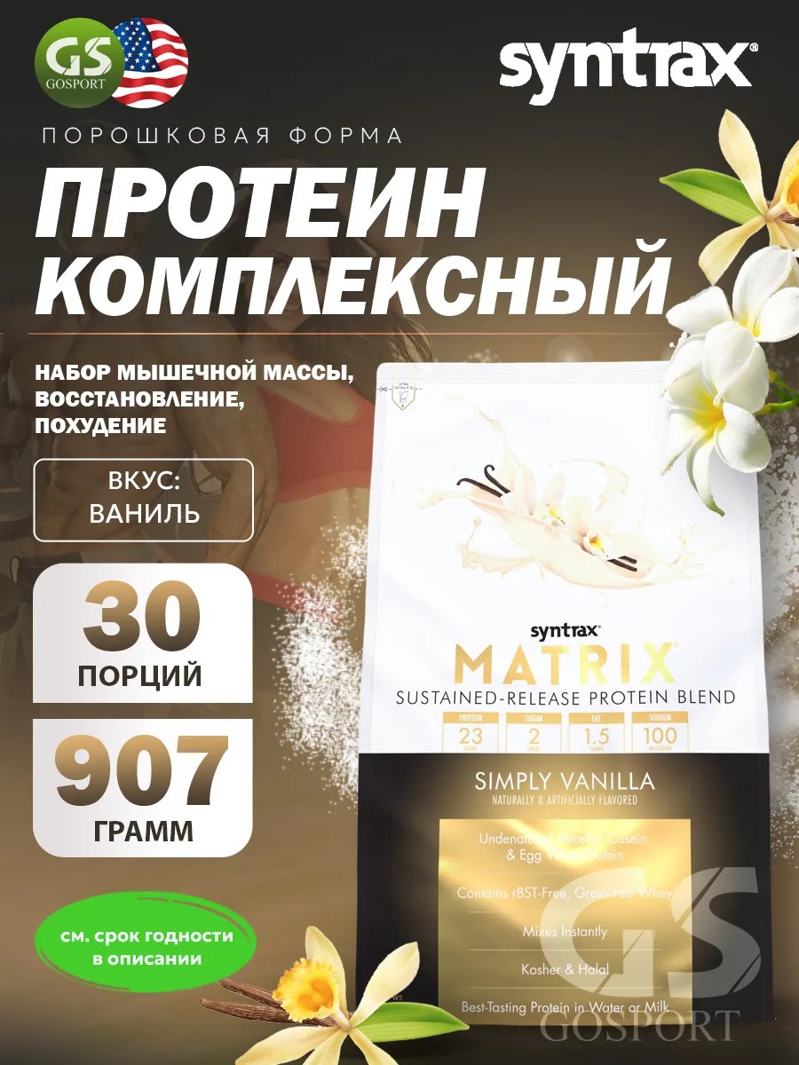 Expire date: May 15, 2027. Matrix Complete Protein, 2 lbs, 907 g, Vanilla. Expires November 15, 2026. Matrix Complete Protein, 907 g. Syntrax's multi-component Matrix protein will become an indispensable aid in achieving your fitness goals. Protein is the body's primary building block. It plays a vital role in muscle growth and post-workout recovery. That's why complete protein is an essential component of professional sports nutrition for athletes and those involved in sports. Matrix Complete Protein is the ideal protein shake for muscle mass gain and growth. It contains several types of high-quality proteins, such as ultrafiltered whey protein, ultrafiltered milk protein, undenatured egg white, and glutamine peptides, allowing you to get all the essential amino acids for effective muscle growth and recovery in a single shake. This blend of proteins not only tastes great but also offers unmatched health benefits. This product is suitable for both men and women who are involved in sports, fitness, and striving for results. Matrix, a multi-component protein, is an excellent supplement to sports nutrition for those looking to improve their physical fitness and increase muscle mass. This product is also ideal for those looking to lose weight. Matrix Protein will help you control your appetite thanks to its high protein content, which promotes a feeling of satiety. It also speeds up your metabolism, promoting fat loss and maintaining lean muscle mass. This supplement restores the body after intense workouts, promotes muscle growth, and increases endurance. Matrix Complex Protein is more than just a protein drink; it's an innovative product for achieving your fitness goals. Directions for use: Mix one scoop of powder with 240 ml of water or milk. For those requiring a reduced protein intake, mix half a scoop with 120 ml of water or milk. Mixing with milk adds more calories. Take Matrix two to three times daily to meet your protein needs. Remember, the best times to take protein are first thing in the morning, after intense physical activity such as weight training, and right before bed.