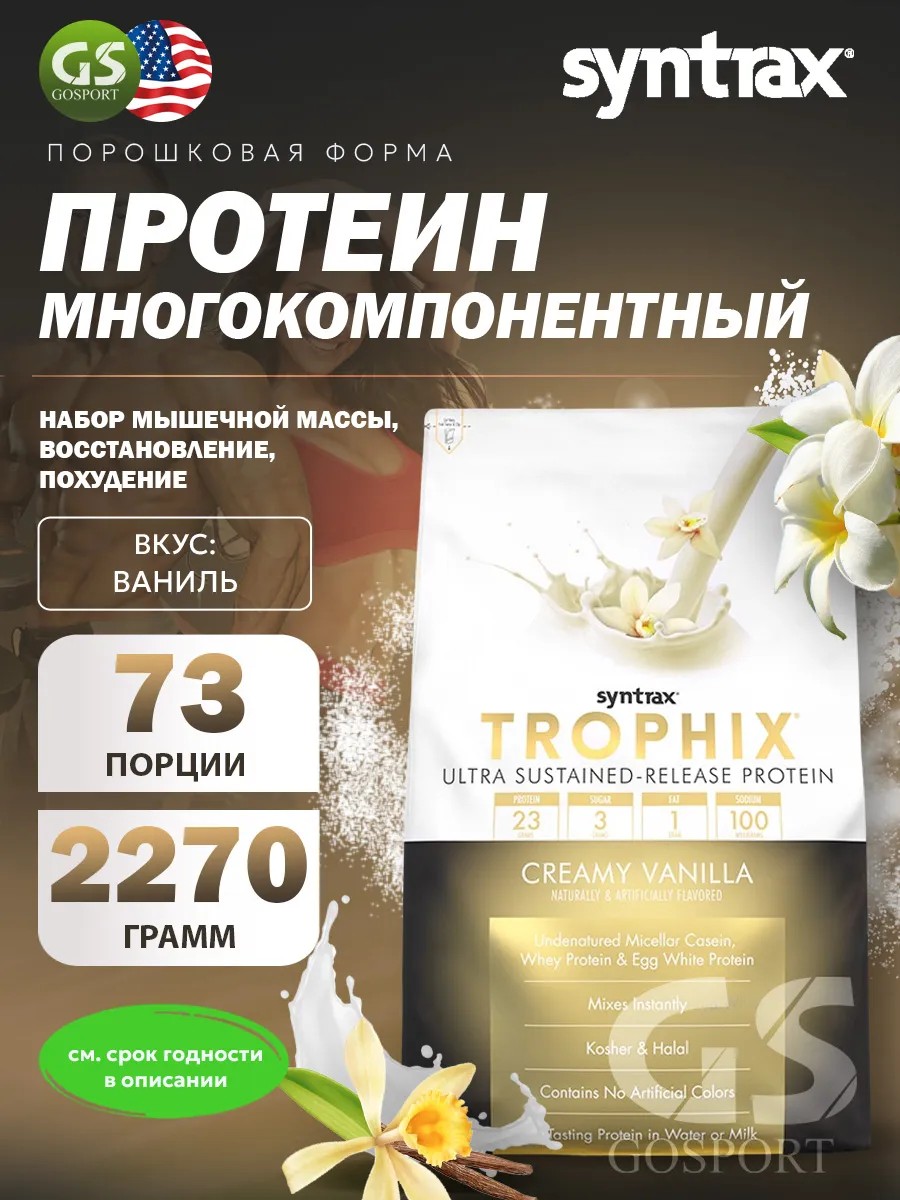 Комплексный протеин Trophix 2270 г, Ваниль. Не упустите возможность улучшить свою физическую форму и достичь новых высот в тренировках с помощью качественного спортивного продукта - протеина SYNTRAX Trophix . Протеин - это основной строительный блок нашего организма. Он необходим для роста и восстановления мышц, поэтому так важно получать достаточное количество высококачественного белка. SYNTRAX Trophix предлагает вам комплекс протеиновых компонентов - казеин, яичный альбумин, сывороточный протеин и пептиды глютамина, чтобы удовлетворить все потребности вашего организма. Основным и превалирующим источником белка в Trophix выступает казеин – медленно действующий белок, усваиваемый организмом в течение длительного периода действия. Он содержит ВСАА (важных аминокислот), которые являются основой для роста мышц и восстановления после тренировок. Благодаря этому протеину ваш организм будет получать необходимое питание, которое усилит результаты вашего тренировочного процесса. SYNTRAX Trophix - это не просто протеиновый коктейль, это комплексное спортивное питание, разработанное специально для спортсменов и людей, активно занимающихся спортом. Он предназначен как для мужчин, так и для женщин, желающих достичь оптимальной формы и улучшить свое здоровье. SYNTRAX Trophix - это белковая добавка, которая поможет вам достичь лучших результатов в похудении или наборе мышечной массы. Этот продукт идеально подходит для тех, кто стремится к здоровому образу жизни и улучшению своей физической формы. Преимущества а SYNTRAX Trophix не ограничиваются просто высоким содержанием белка. Он содержит незначительное количество сахара и не содержит жиров, что делает его прекрасным выбором для тех, кто заботится о своем здоровье и диетическом рационе. Белковый напиток SYNTRAX Trophix - это дополнительный ресурс для вашего организма, который поможет вам достичь ваших фитнес целей. Не упустите возможность улучшить свою физическую форму с помощью протеинового напитка Trophix. Этот продукт рекомендуется к употреблению профессиональными спортсменами и теми, кто стремится к долгосрочным результатам. Сочетая в себе уникальные преимущества каждого из источника белка, Trophix, несомненно, является идеальным протеином, обеспечивающим быструю и длительную поддержку здоровья и восстановления организма. Рекомендации к использованию пищевой добавки: смешайте один мерный совочек с 200 мл воды или молока. При меньших потребностях в белке, смешайте половину мерной ложки с 100 мл жидкости. Принимайте по одному протеиновому коктейлю два или три раза в день, в зависимости от индивидуальных потребностей в протеине. Для достижения наилучших результатов от приема, принимайте по одной порции с утра, непосредственно после пробуждения, после физических нагрузок или тренировки, а также перед отходом ко сну.
