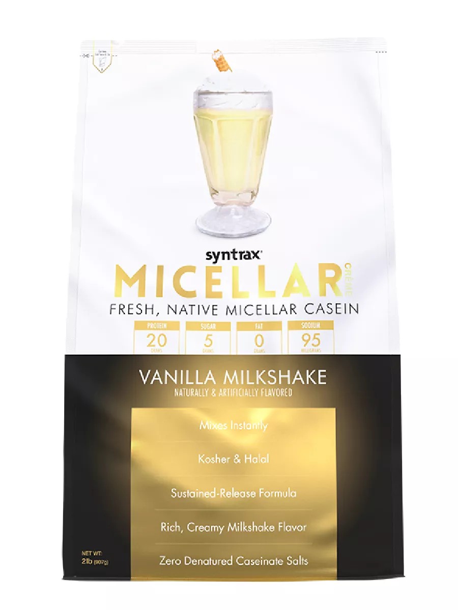 MICELLAR CREME от компании Syntrax является ярким представителем медленных протеинов. В его составе высококачественный мицеллярный казеин без дополнительных примесей. Micellar Creme является долгоусваиваемым протеином и характеризуется медленным высвобождением аминокислот. Он насыщает организм, притупляя чувство голода между приемами пищи, помогая ограничить дневное потребление калорий. А прием Micellar Creme перед сном защищает мышцы от распада в ночное время. Внутри продукта находится пакет с влагоудерживающим агентом. Будьте внимательны!