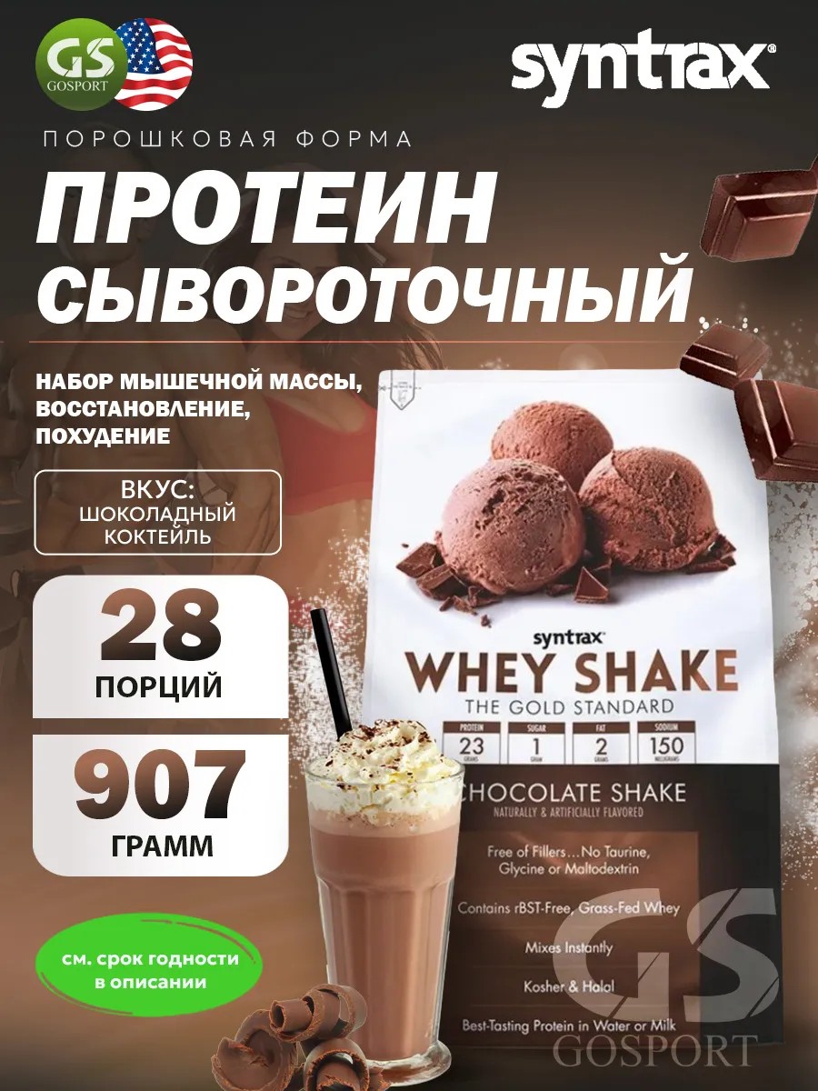 Годен до 15.03.2028. Сывороточный протеин Whey Shake 907 г, Шоколадный коктейль. Whey Shake - это высококачественный продукт не только в теории, но и на практике, тем самым превосходя большинство аналогичных продуктов других производителей. Продукт Whey Shake компании-производителя Syntrax состоит только лишь из 100%-ного концентрата неденатурированного белка молочной сыворотки. Протеин – это основной строительный материал для нашего организма. Он играет важнейшую роль в росте мышц и восстановлении организма после тренировок. Именно поэтому сывороточный протеин является неотъемлемым компонентом спортивного питания для профессиональных спортсменов и людей, занимающихся спортом. Whey Shake – это идеальный протеиновый коктейль для набора мышечной массы и роста мышц. Он содержит все необходимые аминокислоты, которые способствуют быстрому восстановлению мышц и стимулируют их рост. Продукт подходит как мужчинам, так и женщинам, которые занимаются спортом и стремятся к достижению результатов. Концентрат сывороточного протеина является отличным дополнением к профессиональному спортивному питанию для тех, кто хочет улучшить свою физическую форму, увеличить мышечную массу. Этот продукт также идеален для тех, кто хочет похудеть. Концентрат сывороточного протеина поможет вам контролировать аппетит благодаря высокому содержанию белка, который создает чувство сытости. Также он ускоряет обмен веществ, способствуя потере лишнего жира и сохранению сухой мышечной массы. Эта добавка восстанавливает организм после интенсивных тренировок, способствует здоровому росту мышц и повышает выносливость. Whey Shake - это не просто напиток, а инновационный продукт для достижения ваших спортивных целей. Также этот высококачественный продукт, который может употреблять каждый, кому не хватает белка. Он может хорошо помочь спортсменам, для которых очень важно принимать качественный и чистый протеин, Whey Shake также подходит просто людям, ведущим активный образ жизни, после операций по удалению избыточной жировой ткани, а также пожилым людям. Рекомендации по применению пищевой добавки: смешайте 1 мерную ложку с горкой (32 г) с 250 мл воды. Потребляйте готовый протеиновый коктейль в любое время дня. Лучшее время для приёма: утром сразу после пробуждения, после физической активности, непосредственно перед ночным сном.