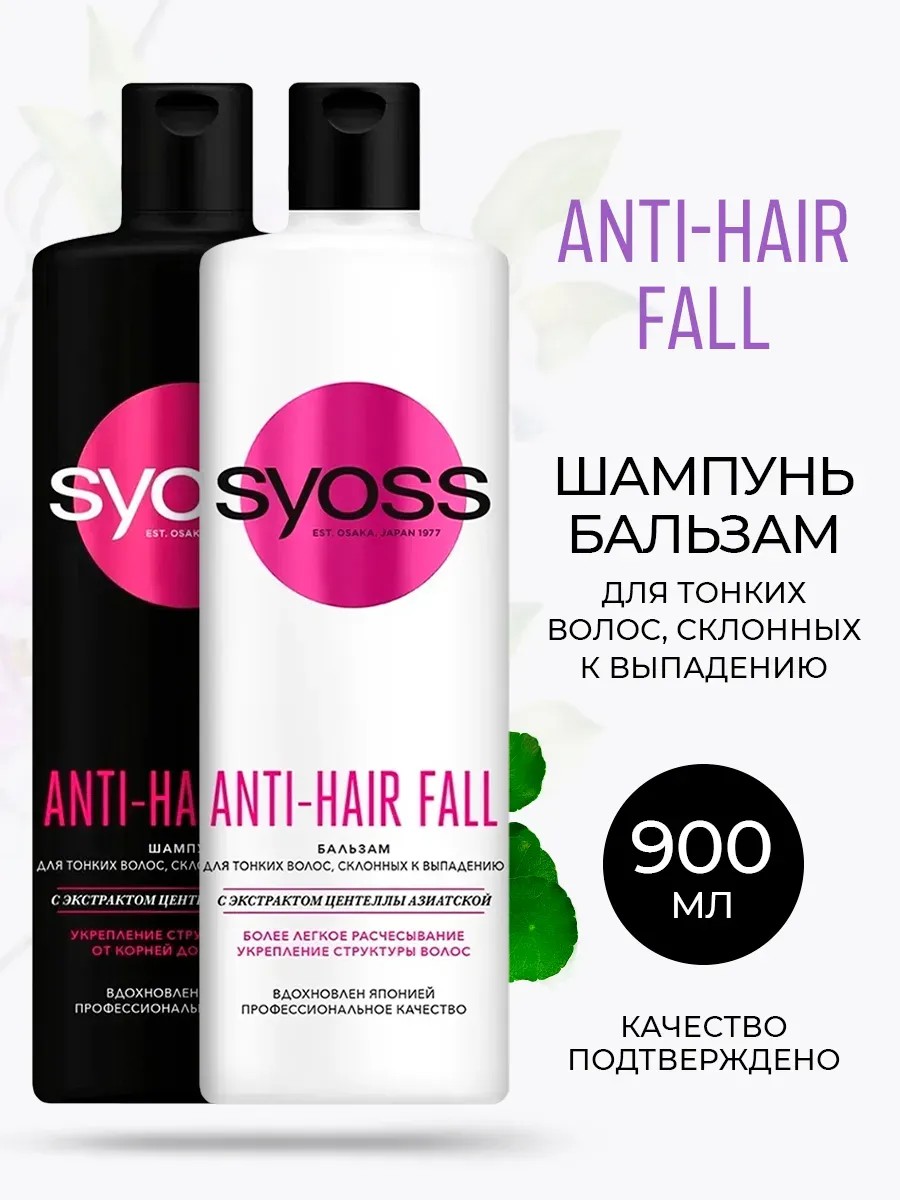 Шампунь и бальзам для волос SYOSS ANTI-HAIR FALL созданы специально для тонких женских волос, склонных к выпадению. Формула с фито-комплексом стволовых клеток. Действует непосредственно на корни волос. Укрепляет волосы по всей длине до самых кончиков. Волосы длинные и крепкие. Это средство поможет в кратчайшие сроки избавиться от проблемы выпадения волос. Формула данного продукта с органическими компонентами снижает выпадение на 80-90 процентов уже через две недели регулярного использования. Шампунь также восстанавливает волосы по всей длине от самых корней. Как это действует? Экстракт растительных стволовых клеток кондиционирует волосы, укрепляет их корни. Пантенол защищает пряди от различных негативных факторов, кератин повышает прочность и эластичность, а также делает волосы послушными. В составе шампуня присутствует масло абрикосовых косточек, которое стимулирует рост волос, увлажняет их и защищает от резких температурных перепадов. Помимо всего прочего, продукт ухаживает за кожей головы, насыщая ее полезными веществами. Бальзам ополаскиватель Сьос уменьшает выпадение волос из-за ломкости на 95%. В составе содержится кофеин, стимулирующий корни, что способствует росту волос. Легкое расчесывание и блеск ваших волос заслуга правильно подобранного шампуня и бальзама. В комбинации набор шампунь и бальзам дают эффективный результат. При регулярном использовании происходит укрепление волос по всей длине до самых кончиков.