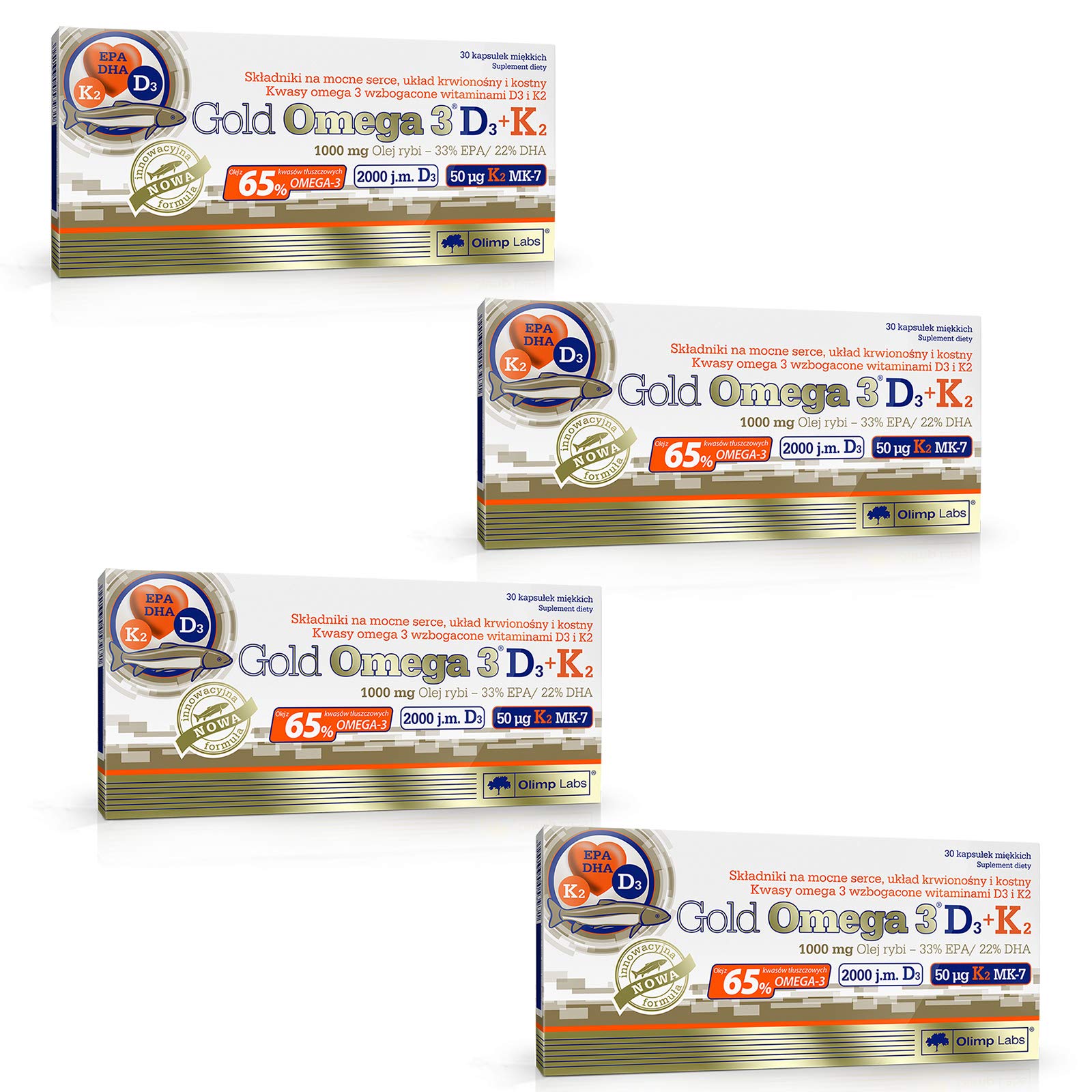 A high-omega-3 food supplement with vitamins D3 and K2. This premium, highly concentrated cold-water fish oil has a standardized 65 omega-3 fatty acid content, supplementing the diet with essential omega-3 fatty acids. Gold Omega 3 D3 K2 also contains a high amount of natural vitamin K from natto, which is the most digestible and active form of menachinon-7 (vitamin K2). The product has been supplemented with 500 IU of vitamin D3. The omega-3 fatty acids EPA (icosapentaenoic acid) and DHA (ocosahexaenoic acid) contribute to the normal function of the heart (a beneficial effect is obtained when consumption corresponds to 250 mg of EPA and DHA per day). Vitamin D also plays a role in maintaining healthy bones and teeth, ensuring the proper functioning of the immune system. Vitamin K also contributes to the maintenance of healthy bones at the recommended daily intake: 1 capsule per day after a meal with plenty of water. INGREDIENTS As a daily amount (1 capsule): fish oil (65 omega-3 fatty acids), vitamin D3 500 IU, vitamin K2 50 µg, vitamin E 12 mg DIRECTIONS 1 capsule per day after a meal with plenty of water. See more