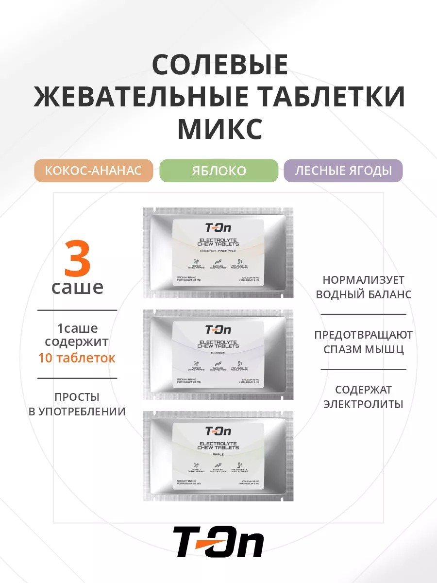 Солевые жевательные таблетки ELECTROLYTE CHEW TABLETS от T-On представляют собой эффективное спортивное питание, разработанное для быстрого восстановления электролитного баланса в организме. Каждая капсула содержит сбалансированный состав минералов, необходимых для поддержания оптимального уровня гидратации и энергии во время интенсивных тренировок или соревнований. Упаковка включает в себя 10 таблеток, что делает этот продукт идеальным выбором для спортсменов и активных людей, стремящихся к максимальной эффективности и быстрому восстановлению после физических нагрузок.