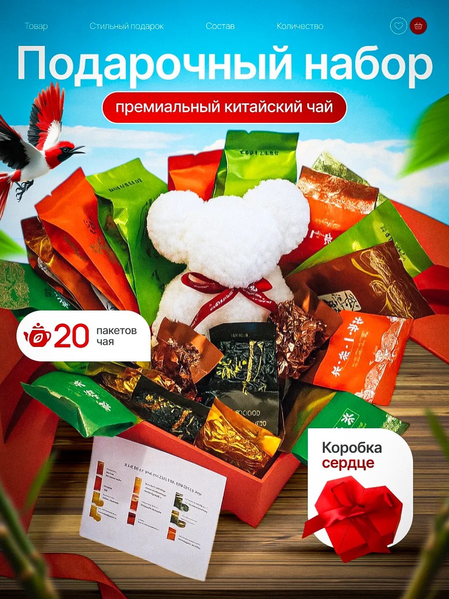 Подарочный набор премиального китайского чая в коробке-сердце — универсальный подарок для любого повода. Внутри 20 пакетиков элитного чая: красный, зелёный, улун и пуэр. Такой подарочный чай станет отличным презентом для коллеги, начальника, учителя, мамы, подруги, любимой или просто на день рождения. Чайный набор в коробке красиво упакован и сразу готов к вручению — это готовый презент, который подарит удовольствие и уют от чаепития. А ещё приятный сюрприз - полотенце в виде белого медвежонка. Идеальный тандем для любого случая