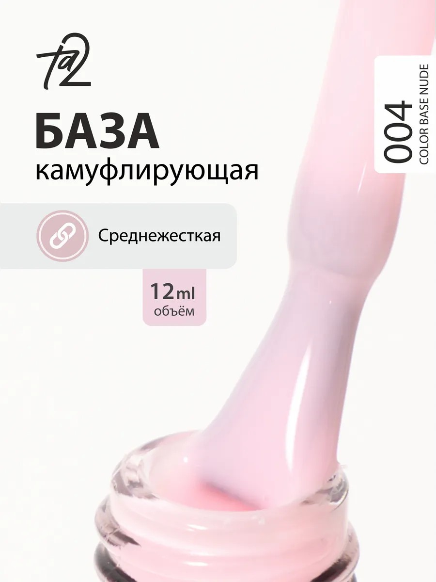 Камуфлирующая база для ногтей или cover base от ТА2 имеет среднюю консистенцию и хорошо самовыравнивается как гель для выравнивания ногтей. Каучуковая база суперэластичная идеально подойдёт как для опытных мастеров, так и для новичков. Камуфлирующая база для ногтей идеально подойдёт для френча или французского маникюра, потому что выглядит как полупрозрачный гель лак. Наша камуфлирующая база такая же популярная как молочная база для ногтей. Камуфляж (комуфляж) для ногтей плотный, средней вязкости , очень комфортный в работе. Камуфлирующая база можно наносить тонким полупрозрачным слоем для легкого оттеночного эффекта или выравнивающим слоем для создания плотного красивого тона. Рекомендуется сделать подложку из прозрачной базы, например база от та2 (арт. 147077815). Подложка обезопасит ногтевую пластину от проникновения цветного пигмента, обеспечит безопасное снятие цветной базы полностью, продлит срок носки. Подложка из прозрачной базы обязательно нужна. База каучуковая ( база рабер) как гель- лаки снимается легко и быстро, фреза не забивается, самое главное база не печёт при снятии. Носка геля до 8 недель при правильном нанесении и уходе. Молочная база милк гель или белая база для ногтей самая популярная, она ложится как молочный гель лак. Камуфлирующая база идеальное решение для проблемных ногтей. Гель-лак для ногтей по консистенции будет жиже чем гель для выравнивания ногтей.