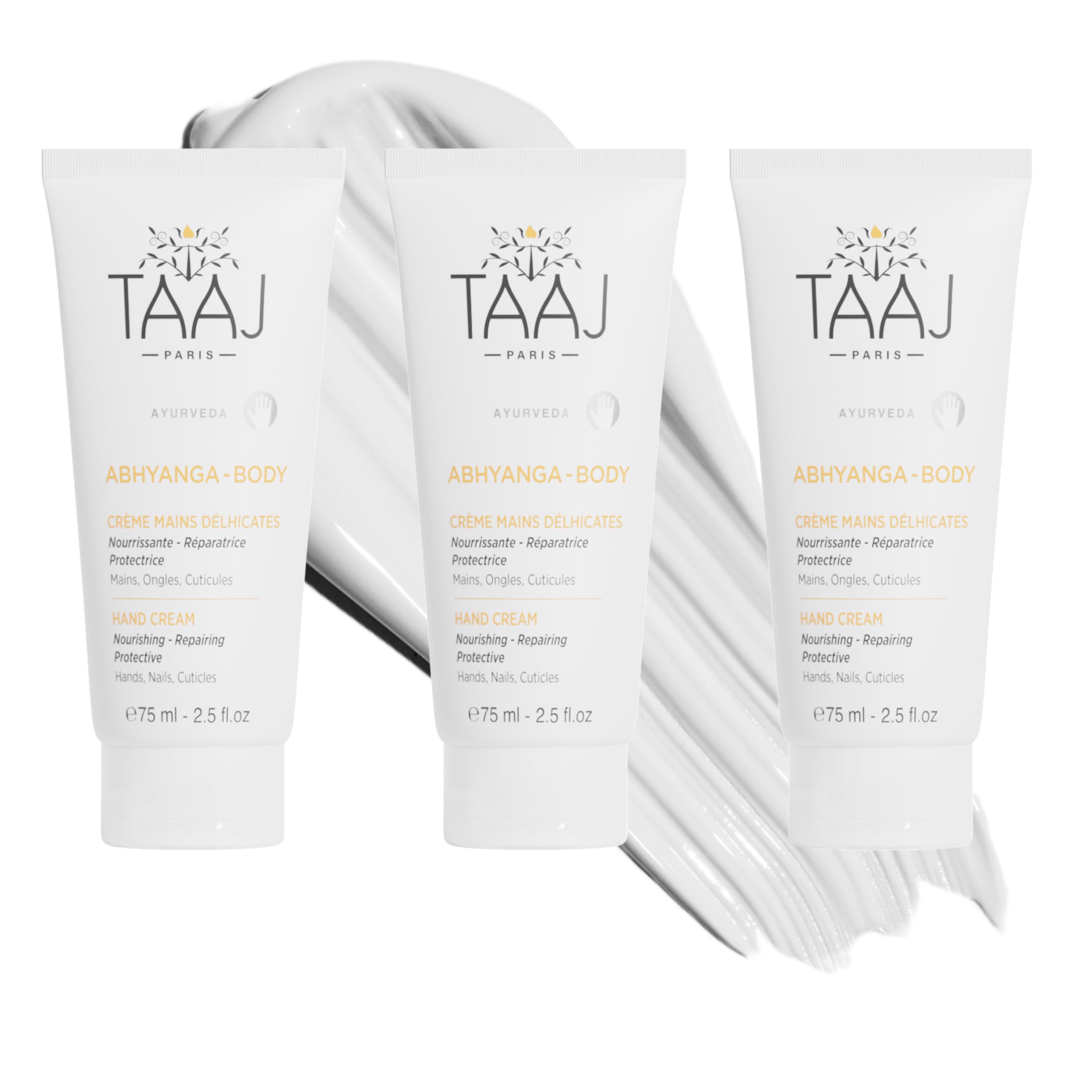 Instructions for use: Apply to hands and nails as often as necessary, paying particular attention to the cuticles. Vegetarian herb-free: TaaJ care is certified as vegan by the Global Vegetarian Certification Services. This care does not contain any ingredients of animal origin. The TAAJ care is certified by PETA Cruelty Free. This seal confirms that TAAJ Paris does not conduct animal testing on its ingredients, formulations or finished products. Without parabens, without phenoxyethanol, without mineral oils, without alcohol. Developed in France: Developed in France in collaboration with a laboratory in India on the Himalayan plateaus, TAAJ care products are based on Himalayan spring water - a highly pure and biocompatible water that is the origin of ancient Indian legends - and plant extracts. 95 ingredients of natural origin synergy of active ingredients: shea butter - wheat germ oil - cinnamon oil - aloe vera - sweet almond oil. Hand cream: the Délhicates hand cream gives even the most stressed hands comfort and suppleness. Enriched with moisturizing, restorative and protective active ingredients, the hand cream soothes and nourishes the hands intensively, without being greasy. The gently perfumed hands are supple, smooth and delicate. Hands, nails, cuticles - Doshas: Vata, Pitta, Kapha.TAAJ ABHYANGA Delhicated handcrème, voedt, repareert en kalmeert handen en nagels, verrijkt met vettende, reparerende en beschermende werkzame stoffen, veganistisch, verpakking van 3 x 75 mlGebruiksaanwijzing: zo vaak als nodig op handen en nagels aanbrengen en daarbij vooral op de nagelriemen letten. Vegetarian vrij van kruiden: de TaaJ-verzorging is door de Global Vegetarian Certification Services als veganistisch gecertificeerd. Deze verzorging bevat geen ingrediënten van dierlijke oorsprong. De TAAJ verzorging is gecertificeerd door PETA Cruelty Free. Dit zegel bevestigt dat TAAJ Paris geen dierproeven uitvoert voor zijn ingrediënten, formuleringen of eindproducten. Zonder parabenen, zonder fenoxyethanol, zonder minerale oliën, zonder alcohol. Ontwikkeld in Frankrijk: de TAAJ-verzorgingsproducten zijn in Frankrijk ontwikkeld in samenwerking met een laboratorium in India op de hoogvlakken van de Himalaya en zijn gebaseerd op Himalaya bronwater - een zeer zuiver en biocompatibel water dat de oorsprong is van oude Indiase legendes - en plantenextracten. 95 ingrediënten van natuurlijke oorsprong synergie van werkzame stoffen: sheaboter - tarwekiemolie - kaneelolie - aloë vera - zoete amandelolie. Handcrème: de Délhicates handcrème geeft zelfs de meest belaste handen comfort en soepelheid. Verrijkt met hydraterende, herstellende en beschermende werkzame stoffen, kalmeert en voedt de handcrème de handen intensief, zonder vettig te zijn. De zacht geparfumeerde handen zijn soepel, glad en delicaat. Handen, nagels, nagelriemen - Doshas: Vata, Pitta, Kapha.
