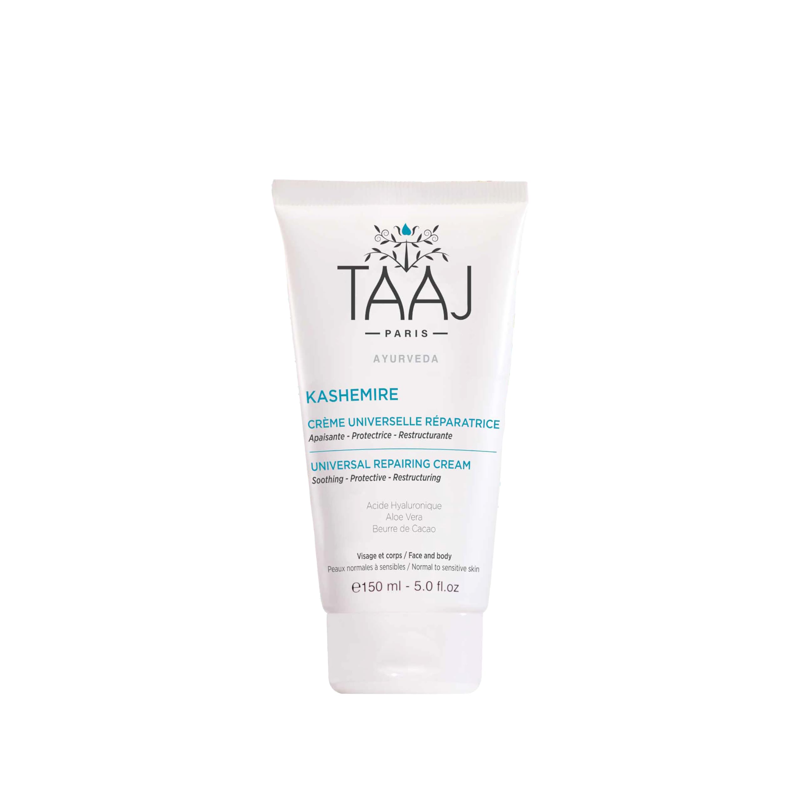 TAAJCashmere Universal Repair CreamFace and Body CareFor Compromised and Irritated SkinDeeply Nourished and Hydrated SkinMade in FranceVeganCruelty-Free150ML Item Volume: 150.0 milliliters INGREDIENTS Aqua (Water) , Caprylic Capric Triglyceride , Cetearyl Alcohol , Glycerin , Glyceryl Stearate , Mimosa Tenuiflora Bark Extract , Prunus Amygdalus Dulcis (Sweet Almond) Oil , Steareth-21, Garcinia Indica (Kokum) Seed Butter , Simmondsia Chinensis (Jojoba) Seed Oil , Glyceryl Caprylate , Theobroma Cacao (Cocoa) Seed Butter , Diheptyl Succinate , Aloe Barbadensis Leaf Juice , Panthenol, Heptyl Glucoside , Cera Alba (Beeswax) , Tocopheryl Acetate, Ceteareth-20 , Sodium Benzoate, Sodium Stearoyl Glutamate , Potassium Sorbate, Sodium PCA, Allantoin, Copolymer , Heptanol. [2.5] ingredients of natural origin (95 ). No HE. Not VeganCONTENTS 1x150ML Kashemire Universal Repair Cream. TAAJ Developed in France in partnership with a laboratory in India located on the Himalayan plateaus, TAAJ treatments are made with Himalayan Spring Water, plant extracts and natural oils, whose synergies have beneficial properties on the body. DIRECTIONS FOR USE Apply a small amount of cream to previously cleansed and dried skin morning and or evening, until completely absorbed. Focus on the areas of the face and body to be soothed. RESULTS Aloe vera is known for its antibacterial, regenerative and regenerative properties. This fragrance-free treatment softens the epidermis. The skin is soft and comfortable. UNIVERSAL REPAIR CREAM Developed specifically for weakened and irritated skin, Universal Repair Cream is rich in hyaluronic acid, providing instant pain relief and hydration. TAAJCrème réparatrice universelle CachemireSoins du visage et du corpsPour peau fragilisée et irritéePeau profondément nourrie et hydratéeFabriqué en FranceVégétalienSans cruauté150ML Volume de l'article : 150,0 millilitres INGRÉDIENTS Aqua (Water) , Caprylic Capric Triglyceride , Cetearyl Alcohol , Glycerin , Glyceryl Stearate , Mimosa Tenuiflora Bark Extract , Prunus Amygdalus Dulcis (Sweet Almond) Oil , Steareth-21, Garcinia Indica (Kokum) Seed Butter , Simmondsia Chinensis (Jojoba) Seed Oil , Glyceryl Caprylate , Theobroma Cacao (Cocoa) Seed Butter , Diheptyl Succinate , Aloe Barbadensis Leaf Juice , Panthenol, Heptyl Glucoside , Cera Alba (Beeswax) , Tocopheryl Acetate, Ceteareth-20 , Sodium Benzoate, Sodium Stearoyl Glutamate , Potassium Sorbate, Sodium PCA, Allantoin, Xanthan Gum , Glyceryl Undecylenate , Sodium Hyaluronate , Lactic Acid, Carbomer, Stearic Acid , Capryloyl Glycerin Sebacic Acid Copolymer , Heptanol. [2.5] ingrédients d'origine naturelle (95 ). Pas d'HE. Pas VeganCONTENU 1x150ML Crème Universelle Réparatrice Kashemire. TAAJ Développés en France en partenariat avec un laboratoire en Inde situé sur les plateaux de l'Himalaya, les soins TAAJ sont élaborés à base d'Eau de Source de l'Himalaya, d'extraits de plantes et d'huiles naturelles, dont les synergies ont des propriétés bienfaisantes sur le corps. CONSEILS D'UTILISATION Appliquer une noisette de crème sur peau préalablement nettoyée et séchée matin et ou soir, jusqu'à pénétration complète. Insister sur les zones du visage et du corps à apaiser. RÉSULTATS L'aloe vera est connu pour ses propriétés antibactériennes, régénératrices et régénératrices. Ce soin sans parfum adoucit l'épiderme. La peau est douce et confortable. CRÈME UNIVERSELLE RÉPARATRICE Développée spécifiquement pour les peaux fragilisées et irritées, la Crème Réparatrice Universelle est riche en acide hyaluronique, procurant un soulagement instantané de la douleur et une hydratation.