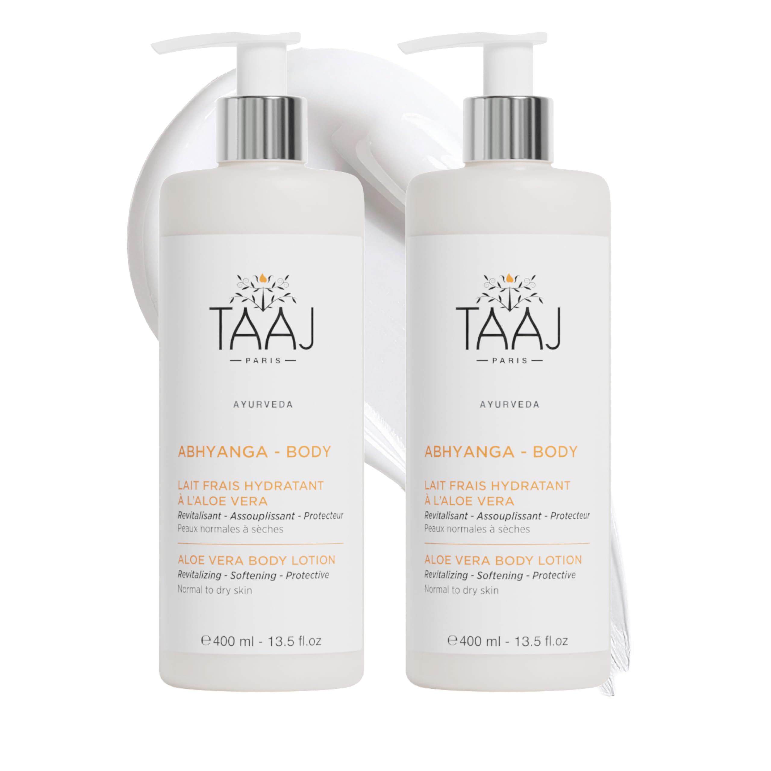 Sold in a pack of 2 - TAAJ ABHYANGA Aloe Vera Refreshing Moisturizing Lotion is the perfect solution for normal to dry skin! This rich and luxurious moisturizing lotion provides intense hydration in one step, filling the skin with essential moisture. Its unique active ingredients, such as aloe vera, balance the skin's hydrolipidic levels and promote a healthy, radiant complexion. Its light, refreshing texture absorbs quickly and is non-greasy, making it an ideal choice, even for the most sensitive skin. Use this body lotion daily to enjoy softer, smoother, and fresher-looking skin. TAAJ ABHYANGA Aloe Vera Refreshing Moisturizing Lotion is the perfect product for those seeking deeply hydrated skin with a healthy glow. SAFETY WARNING For external use only.DIRECTIONS FOR USE Apply daily to the entire body. TAAJ TAAJ products help maintain healthy skin (face and body) all year round. Developed with Himalayan spring water, plant extracts, and essential oils, they give your skin radiance and tone, and slow down skin aging. DEVELOPED IN FRANCE Developed in France in partnership with a laboratory in India located on the Himalayan plateaus, TAAJ skincare products are formulated with Himalayan Spring Water – very pure and biocompatible water that is the source of ancient Indian legends – and plant extracts. 97 NATURALLY DERIVED INGREDIENTS SYNERGY OF ACTIVE INGREDIENTS: Hyaluronic Acid, Aloe Vera, Camellia Oil, Moringa Butter, Silk Proteins. PACK OF 2 - FRESH MOISTURIZING LOTION WITH ALOE VERA This Fresh Moisturizing Lotion with Aloe Vera soothes, hydrates, and revitalizes the body in one step. Rich in regenerating, softening, and protective active ingredients, this lotion helps maintain the skin's hydrolipidic balance. Its light and refreshing texture absorbs quickly without leaving a greasy residue. Hydrated and protected, the skin is supple, soft, and fresh. Normal to dry skin – Doshas: Pitta, Vata.TAAJ Lait Frais Hydratant à l'Aloé Véra - ABHYANGA Apaise, Hydrate Revitalise le corps Actifs Régénérants, Adoucissants Protecteurs Peau Hydratée Vegan Lot de 2x 400 mlDESCRIPTION DU PRODUIT DESCRIPTION DU PRODUIT Vendu en lot de 2 - TAAJ ABHYANGA Lait Frais Hydratant À L'Aloe Vera est la solution parfaite pour les peaux normales à sèches ! Ce lait frais hydratant, riche et luxueux, procure une hydratation intense en une seule étape, remplissant la peau d'une hydratation essentielle. Ses ingrédients actifs uniques, comme l'aloe vera, équilibrent les niveaux hydrolipidiques de la peau et favorisent un teint sain et éclatant. Sa texture légère et rafraîchissante pénètre rapidement et n'est pas grasse, ce qui en fait un choix idéal, même pour les peaux les plus sensibles. Utilisez cette lotion corporelle quotidiennement pour profiter d'une peau plus douce, plus lisse et plus fraîche. TAAJ ABHYANGA Lait Frais Hydratant À L'Aloe Vera est le produit idéal pour ceux qui recherchent une peau profondément hydratée avec un éclat sain. AVERTISSEMENT DE SÉCURITÉ Usage externe uniquement.CONSEILS D'UTILISATION Appliquer quotidiennement sur tout le corps. TAAJ Les produits TAAJ permettent le maintien d'une peau saine (visage et corps) tout au long de l'année. Développés à base d'eau de source de l'Himalaya, d'extraits de plantes et d'huiles essentielles, ils confèrent à votre peau éclat, tonicité et ralentissent le vieillissement cutané. DÉVELOPPÉ EN FRANCE Développés en France en partenariat avec un laboratoire en Inde situé sur les plateaux de l'Himalaya, les soins TAAJ sont élaborés à base d'Eau de Source de l'Himalaya – eau très pure et biocompatible à l'origine de vieilles légendes indiennes – et d'extraits de plantes. 97 D'INGRÉDIENTS D'ORIGINE NATURELLE SYNERGIE D'ACTIFS: Acide Hyaluronique Aloe Vera Huile de Camélia Beurre de Moringa Protéines de Soie. LOT DE 2 - LAIT FRAIS HYDRATANT À L'ALOE VERA Le Lait Frais Hydratant à l'Aloe Vera apaise, hydrate et revitalise le corps en un seul geste. Riche en actifs régénérants, adoucissants et protecteurs, ce soin permet de maintenir l'équilibre hydrolipidique de la peau. Sa texture légère et rafraîchissante pénètre très rapidement sans effet gras. Hydratée et protégée, la peau est souple, douce et fraîche. Peaux normales à sèches – Doshas : Pitta, Vata.