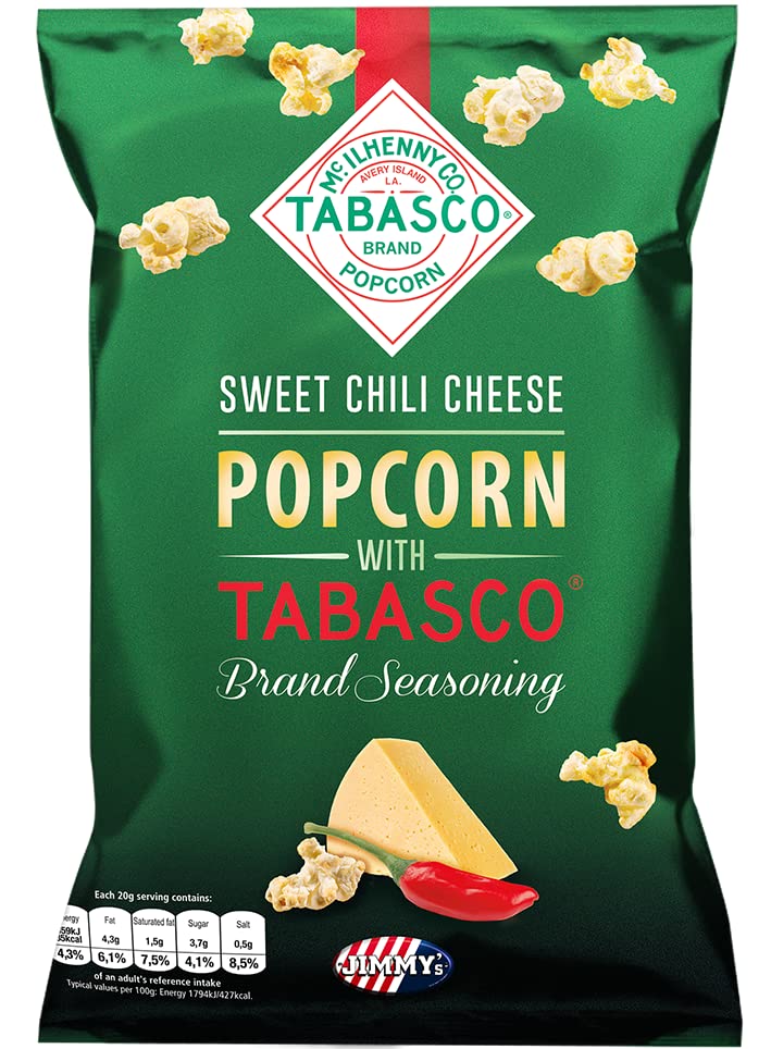 Popcorn seasoned with the famous Tabasco sauce for a subtly spicy taste blended with a delicious cheesy aroma. INGREDIENTS Corn, vegetable oil (palm), sugar, cheese flavoring (13 ) (corn starch, lactose (milk), salt, granulated sugar, natural flavoring: milk (contains butter), onion, garlic powder, color: bell pepper extract, food acid: lactic acid, antioxidant: rosemary extract), TABASCO brand spray dry flavoring (1.3 ) (TABASCO brand pepper sauce (distilled vinegar, pepper, salt), maltodextrin). INSTRUCTIONS FOR USE Consume after opening. SAFETY WARNING Store in a cool, dry place. See more Popcorn seasoned with the famous Tabasco sauce for a subtly spicy taste blended with a delicious cheesy aroma. INGREDIENTS Corn, vegetable oil (palm), sugar, cheese flavoring (13 ) (corn starch, lactose (milk), salt, granulated sugar, natural flavoring: milk (contains butter), onion, garlic powder, color: bell pepper extract, food acid: lactic acid, antioxidant: rosemary extract), TABASCO brand spray dry flavoring (1.3 ) (TABASCO brand pepper sauce (distilled vinegar, pepper, salt), maltodextrin). INSTRUCTIONS FOR USE Consume after opening. SAFETY WARNING Store in a cool, dry place. See moreJIMMY'S Popcorn Tabasco Sweet Chili Cheese 90 g - Pack de 8DESCRIPTION DU PRODUIT DESCRIPTION DU PRODUIT Popcorn assaisonnés à la célèbre sauce Tabasco pour un gout relevé subtilement mêlé à un délicieux parfum de fromage. INGRÉDIENTS maïs, huile végétale (palme), surcre, arôme de fromage (13 ) (amidon de maïs, lactose (lait), sel, sucre en pudre, arôme naturel : lait (contient du beurre), oignon, poudre d'ail, colorant : extrait de poivron, acidealimentaire : acide lactique, antioxidant : extrait de romarin), TABASCO brand spray dry flavoring (1,3 ) (TABASCO brand pepper sauce (vinaigre distillé, poivre, sel), maltodextrine). MODE D'EMPLOI A consommer après ouverture AVERTISSEMENT DE SÉCURITÉ A conserver au sec, à l'abri de le chaleur Voir plus