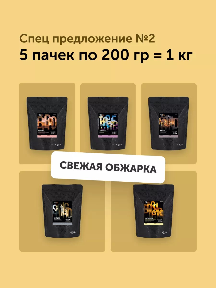 Свежеобжаренный Табера Бильбао - Отличный баланс арабики и робусты. Шоколадное послевкусие, нежная горчинка грейпфрута, цветочный аромат и плотное тело. Хорошо сочетается с молоком.ВАЖНО: На смесь Бильбао не распространяется накопительная система скидок и промокоды!Состав: Арабика 50%, Робуста 50%Во-первых, робуста - это не плохо. И ещё полгода эта смесь простоит на полке, прежде чем её купят. Так плохо. У нас ситуация иная. Стабильная и качественная робуста из Индии вступает в союз с яркой и цветочной арабикой из Эфиопии, чтобы дать нам прекрасную, бодрящую и питкую смесь - Бильбао. Кофеин поможет сохранять бодрость духа в наше непростое время. Состав смеси позволит получать тельную и насыщенную чашку даже на самом простом и не идеально настроенном оборудовании. И вишенка на торте - приятная цена!