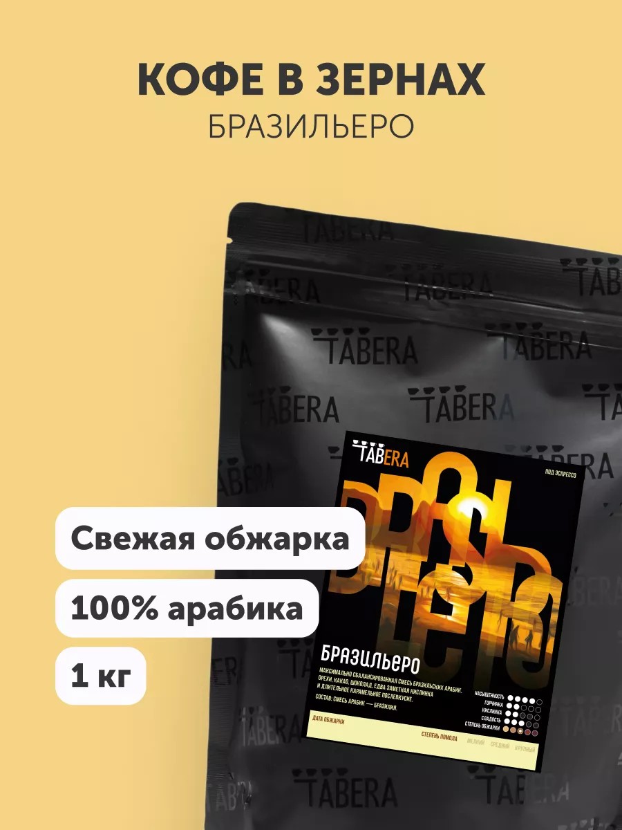 Tabera's freshly roasted Brasileiro coffee beans are 100% Arabica and offer a precise balance of flavor and aroma. The unpackaged product weighs 1 kg. This natural, chemical- and additive-free product has a medium roast. The flavor of this whole-bean coffee is reminiscent of nuts, chocolate, and cocoa. It also features a subtle acidity and a lingering caramel finish. This versatile Brasileiro coffee is a freshly roasted variety. These beans can be prepared in several ways: in a coffee machine, espresso, using a Turkish coffee pot, or using a drip or moka pot. This makes a delicious gift for a coffee shop or barista, who can prepare a cappuccino or Americano for you. This variety is the perfect way to start your morning, allowing you to experience the aromatic flavor of Brazilian Arabica coffee. This gift coffee has the following characteristics on a 5-point scale: richness: 4, bitterness: 2, acidity: 2, sweetness: 3. It pairs well with milk. The benefits of this invigorating drink are obvious. Caffeine will help maintain strength of body and spirit in a variety of situations. The blend's composition allows you to make a rich cup of coffee even with the simplest equipment. The taste of this slightly tart, dense, and full-bodied espresso is a perfect invigorating early morning on weekdays and an ideal digestif for brunch on holidays and weekends. You may have already experienced this flavor in Moscow restaurants, where high-quality Brazilian coffee began selling in the 2000s. Sometimes a touch of nostalgia for the past is so pleasant. Experience it with Brasileiro! Our company has been operating in the coffee bean market for over 10 years, roasting popular Arabica varieties from around the world, purchased directly from farmers. We also offer a wide range of coffee blends to suit every taste. Buy coffee for yourself or as a gift for men on February 23rd, for your mom on Mother's Day, or for friends or colleagues on their birthdays and New Year's. The functional and convenient zip-lock packaging keeps the product fresh.
