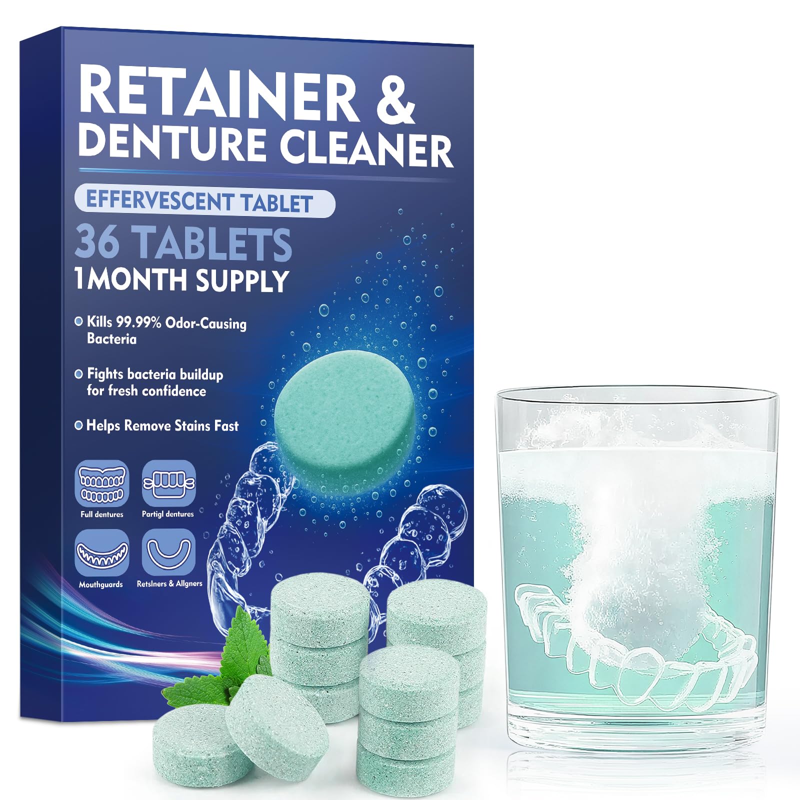 Instructions: Use lukewarm water (35–45 C) to dissolve the cleaning tablet. Avoid hot or cold water. Individually Film-Sealed: Each tablet is film-sealed to ensure maximum freshness and hygiene. Our retainer cleaners are portable and convenient, making them perfect for travel, school, or work. If you are not satisfied with these retainer cleaning tablets or have any issues with our appliance cleaning kit, please contact us anytime for assistance. Quick and Easy Cleaning: Simply drop one tablet into lukewarm or cold water and soak your appliance for 5 to 15 minutes. The retainer cleaning tablets thoroughly clean and refresh your appliance, denture, or aligner in no time, making it easy to fit into your busy schedule. Compatible with All Braces: These retainer cleaning tablets are suitable for all types of braces, including retainers, dentures, aligners, mouthguards, clear aligners, night guards, and even ultrasonic cleaners. Whether you're at home or on the go, these appliance cleaning tablets offer a complete and convenient cleaning solution for your daily oral care routine. Mild Mint Formula: Each retainer cleaning tablet provides a thorough clean while being gentle on braces, dentures, and mouthguards, leaving a refreshing mint scent. The retainer cleaning tablet formula is free of harsh chemicals, ensuring there's no unpleasant taste while keeping your braces fresh and comfortable to wear. Eliminates Stains, Odors, and Yellowing: Our orthodontic retainer cleaning tablets are specially formulated to remove tartar, plaque, and daily buildup on braces, dentures, and aligners. Regular use of retainer cleaning tablets helps keep your braces shiny, fresh, and well-maintained, and helps you feel confident in your smile every day.
