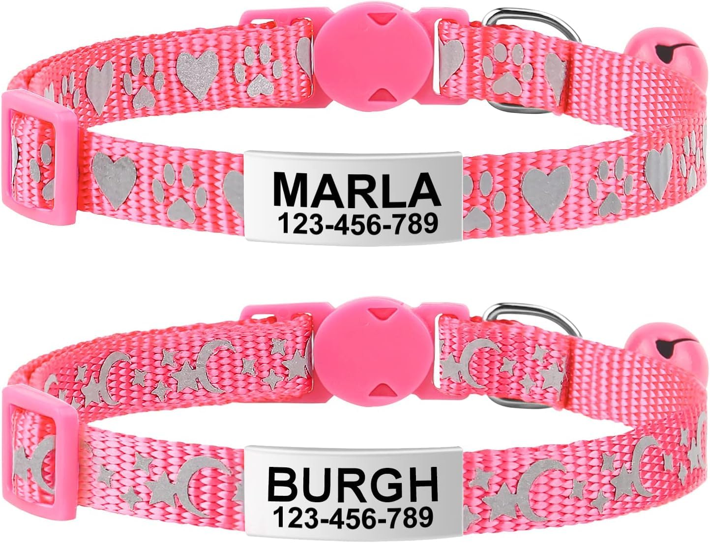 Value Pack: 1* paw heart and 1* stars & moon cat neck band with removable bell.If you want to know where your kitten is, the bell would remind you if it is a little loud, you can easily remove the bell.Adjustable size: 18-28 cm for the neck adjustment of your cat, recommended for cats with a weight of over 3 LB and small puppies.When your cat grows, the collars can be adapted to your cat.Don't forget to measure your pets' neck circumference before ordering.Unique reflective design: sweet pattern with high -reflective design at night, bright colors in the dark, you only need a flashlight to find your pet in a dark environment.Gravated ID tags: There are up to 3 lines with personalized information.You can adapt your cat's name, your phone number or address on the stainless steel sign.They are significantly engraved by laser so that you can easily see the custom information.Improved safety breakaway buckles: Round buckle is safer than sharp ear buckles and the collar is equipped with improved with improved cutting buckles that ensure that your cat does not suffocate on your collar when it gets stuck.Value Pack: 1* Pfote Herz und 1* Sterne & Mond Katzenhalsband mit abnehmbarer Glocke. Wenn Sie wissen möchten, wo Ihr Kätzchen ist, die Glocke würde dich daran erinnern, Wenn es etwas laut ist, können Sie die Klingel auch leicht entfernen. Einstellbare Größe: 18-28 cm für die Halsanpassung Ihrer Katze, empfohlen für Katzen mit einem Gewicht von über 3 lb und kleine Welpen. Wenn Ihre Katze wächst, Die Halsbänder können an Ihre Katze angepasst werden. Vergessen Sie nicht, den Halsumfang Ihrer Haustiere vor der Bestellung zu messen. Einzigartiges reflektierendes Design: Süßes Muster mit hochreflektierendem Design bei Nacht, helle Farben im Dunkeln, Sie brauchen nur eine Taschenlampe, um Ihr Haustier in einer dunklen Umgebung zu finden. Gravierte ID-Tags: Es gibt bis zu 3 Zeilen mit personalisierten Informationen. Sie können den Namen Ihrer Katze anpassen, Ihre Telefonnummer oder Ihre Adresse auf dem Edelstahlschild. Sie werden per Laser deutlich graviert, damit Sie die benutzerdefinierten Informationen einfach sehen können. Verbesserte Sicherheits-Breakaway-Schnallen: Runde Schnalle ist sicherer als scharfe Ohrschnalle und das Halsband ist mit verbesserten Ausgestattet mit verbesserter Trennschnalle, die sicherstellen, dass Ihre Katze nicht an ihrem Halsband erstickt, wenn sie stecken bleibt.TagME 2er-Pack Katzenhalsband mit Namens- und Adressschild, Reflektierendes Katzenhalsband mit Sicherheitsverschluss und Glocke, für Welpe und Katze, Rosa 18-28 cm Rosa