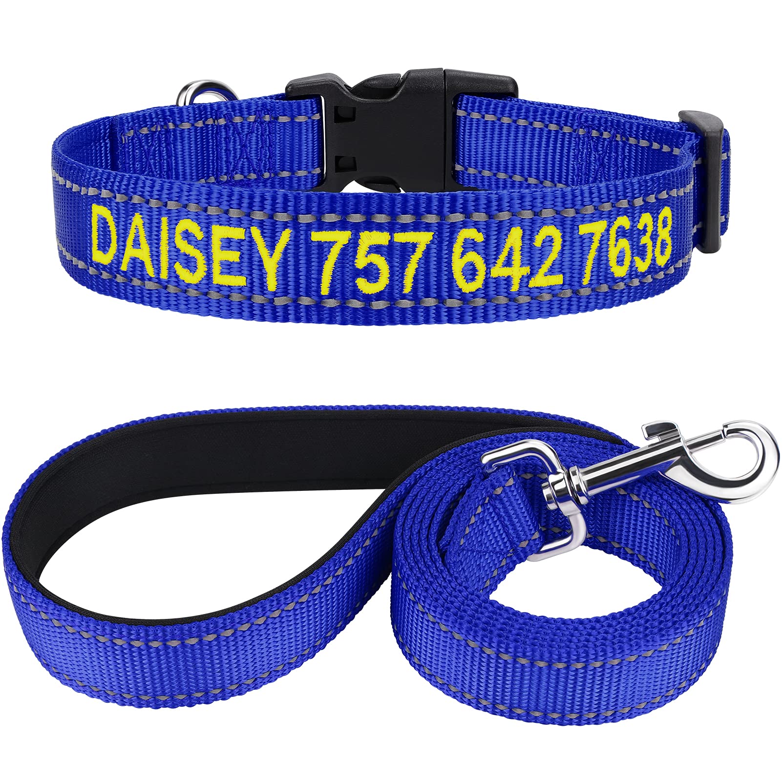 Comfort handle - the handles have a soft upholstery that is padded on the interior, which makes it pleasant to keep.And to protect your hands from burns when pulling.360 metal closure prevents the leash from twisting and tanging, your dog can move freely around you, you have a good control over your dogs.Nylon material - the well -processed dog collar and the leash are made of high -quality nylon fabric, are light but robust and offer your dog ultimate comfort.Perfect for everyday use.Reflecting on the double side - both the collar and the leash are reflective.But the leash is reflective double -sided, both sides are sewn with special reflex threads to improve visibility.This protects your dog during the evening walks or runs.Ideal size-the XSMall dog collar is 1.5 cm wide, 20-30 cm for the neck adjustment Suitable leash: 2.0 cm wide, 1.5m long.This set is suitable for small puppy dogs.Individual embroidery - the name and telephone number of the dog are sewn on the collar to ensure strong and permanent identification.If your dog is lost, others can contact you quickly to return your dog.Exquisite embroidery gives the collar a little more momentum and are not just a security feature.Komfortgriff - Die Griffe haben ein weiches Polster, das am Innengriff gepolstert ist, wodurch es angenehm zu halten ist. Und um Ihre Hände beim Ziehen vor Verbrennungen zu schützen. 360 Metallverschluss verhindert, dass sich die Leine verdreht und verheddert, Ihr Hund kann sich frei um Sie bewegen, Sie haben eine gute Kontrolle über Ihre Hunde. Nylonmaterial - Das gut verarbeitete Hundehalsband und die Leine bestehen aus hochwertigem Nylongewebe, sind leicht, aber robust und bieten Ihrem Hund ultimativen Komfort. Perfekt für den täglichen Gebrauch. Doppelseitig Reflektierend - Sowohl das Halsband als auch die Leine sind reflektierend. Aber die Leine ist DOPPELSEITIG REFLEKTIEREND, beide Seiten sind mit speziellem Reflexfaden vernäht, um die Sichtbarkeit zu verbessern. Das schützt Ihren Hund bei abendlichen Spaziergängen oder Läufen. Ideale Größe - Das Xsmall-Hundehalsband ist 1,5 cm breit, 20-30 cm für die Halsanpassung Passende Leine: 2,0 cm breit, 1,5m lang. Dieses Set ist für kleine Welpenjunghunde geeignet. Individuelle Stickerei - Der NAME und die TELEFONNUMMER des Hundes werden auf das Halsband genäht, um eine starke und dauerhafte Identifizierung zu gewährleisten. Wenn Ihr Hund verloren geht, können andere Sie schnell kontaktieren, um Ihren Hund zurückzugeben. Exquisite Stickereien verleihen dem Kragen etwas mehr Schwung und sind nicht nur ein Sicherheitsmerkmal.TagME Hundehalsband und Leine, Personalisierbar Reflektierendes Hundehalsband Mit 1.5M Doppelseitige Reflektierende Hundeleine für Kleine, Königsblau XS(1er Pack) Königsblau Set